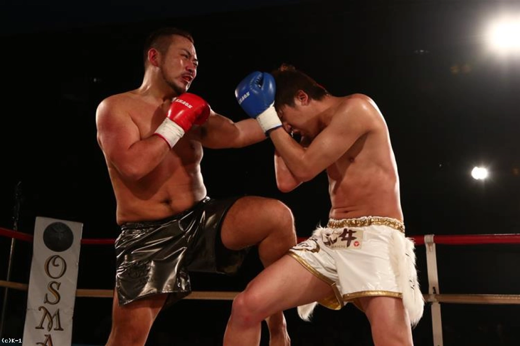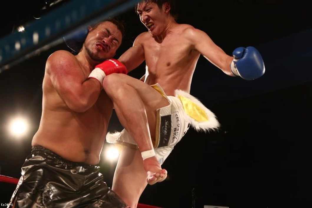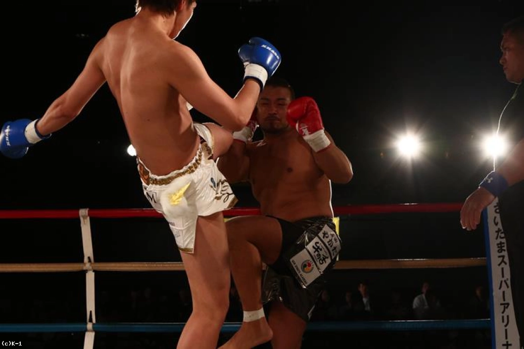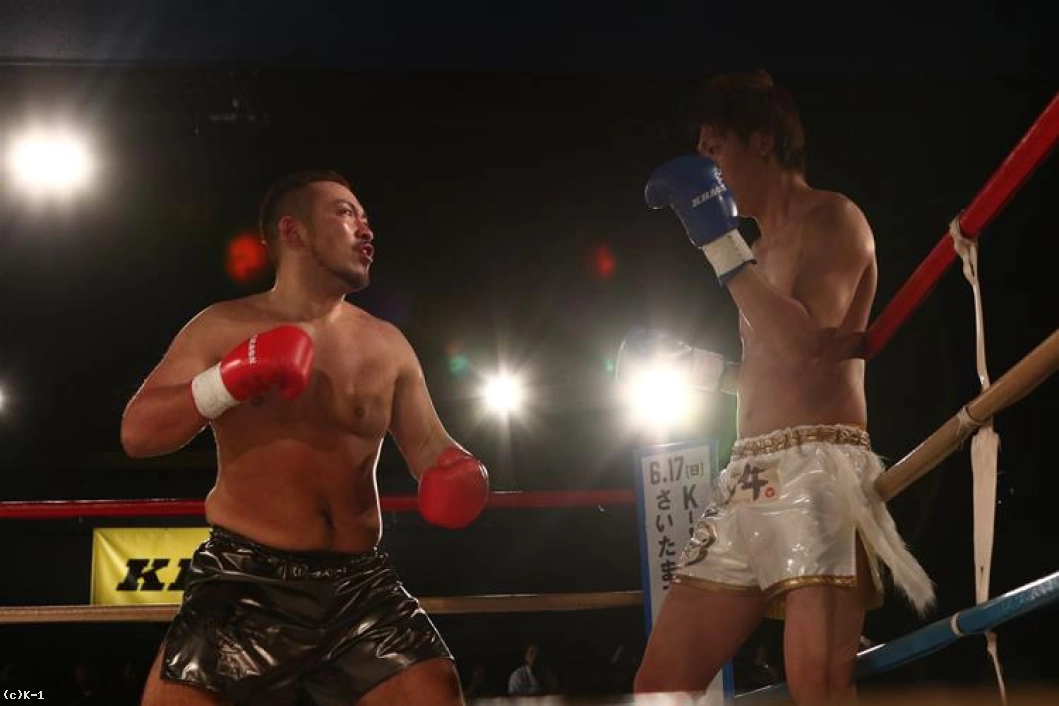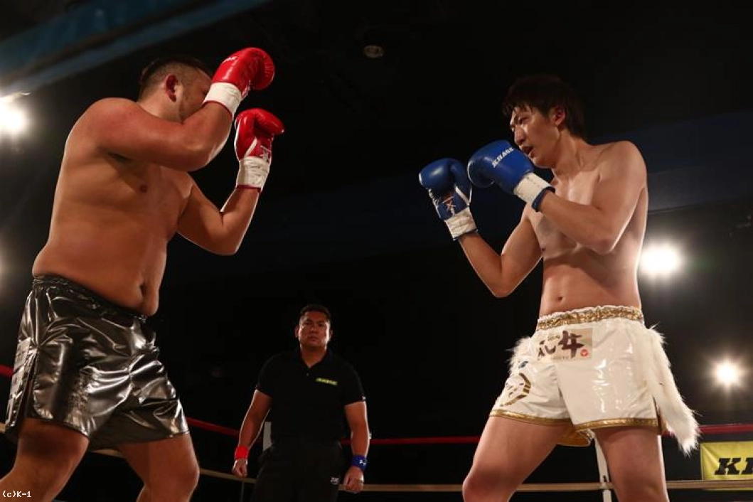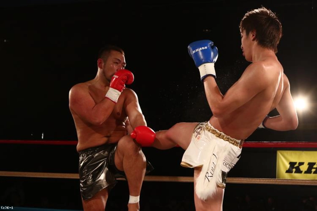 2R、RUIはサウスポーを続行し、左ミドル、左ストレートを駆使して訓に間合いを詰めさせない。RUIの左ミドルを度々浴び、訓の右腕は赤くなっている。RUIは巨体をフワリと浮かせて跳びヒザ蹴りを放ち訓にヒット。訓は左ミドル、ヒザを食らいながらも前に出るが、パンチをクリーンヒットできる距離まで持ち込めない。