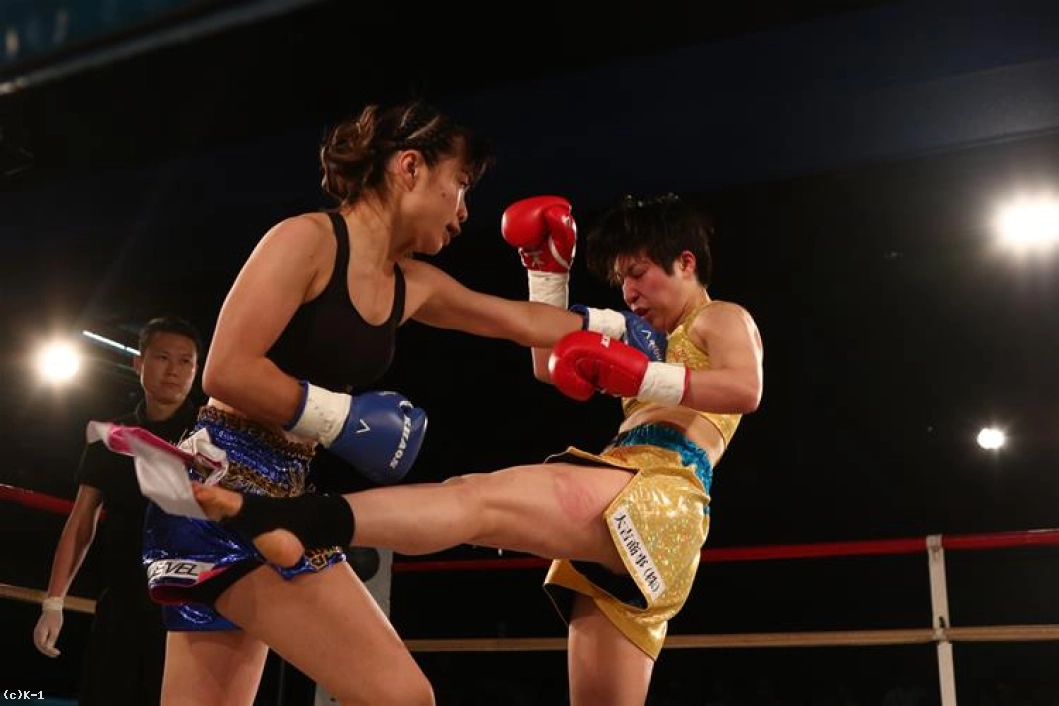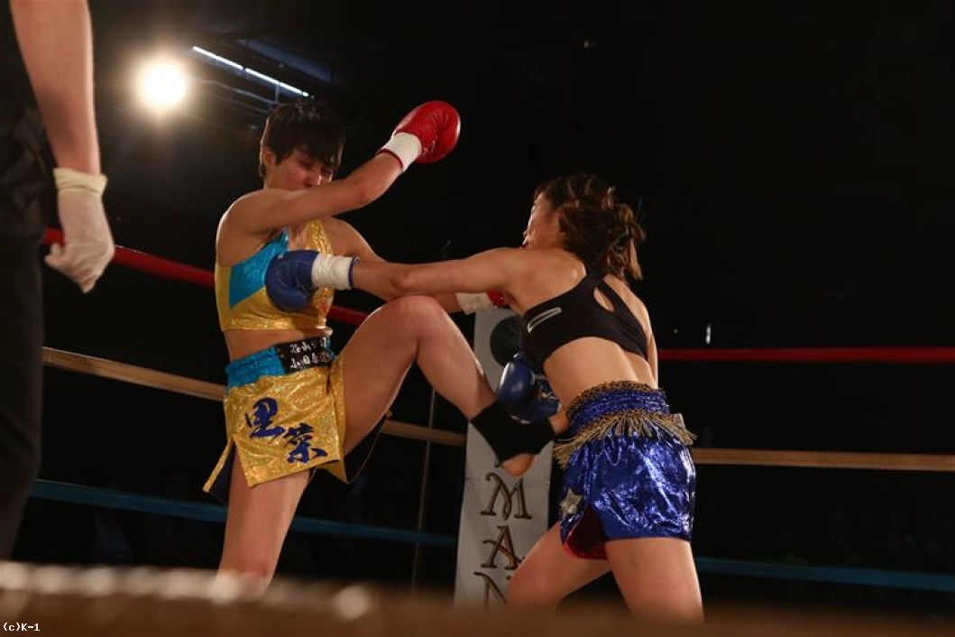 2R、壽美はこのラウンドも左ストレートを中心に前進。RINAはこれを組んで押さえ、離れ際に右ハイキックを放ってヒットする。しかし壽美は前進を落とさずパンチで前に出る。だが、RINAはこれに前蹴り、右ミドルで応戦。