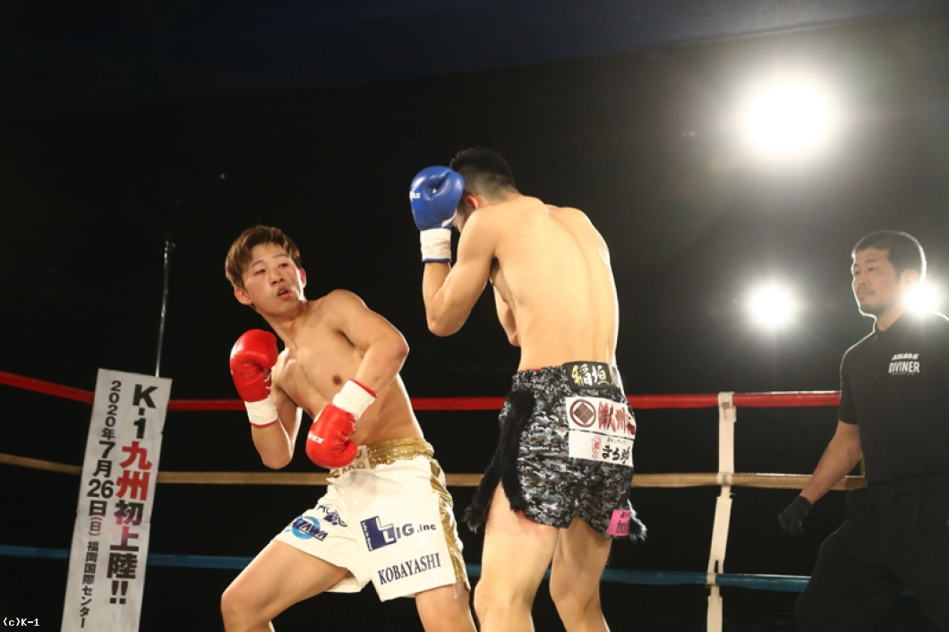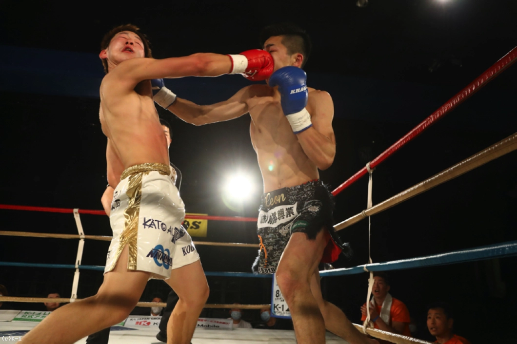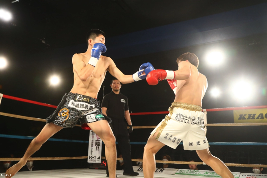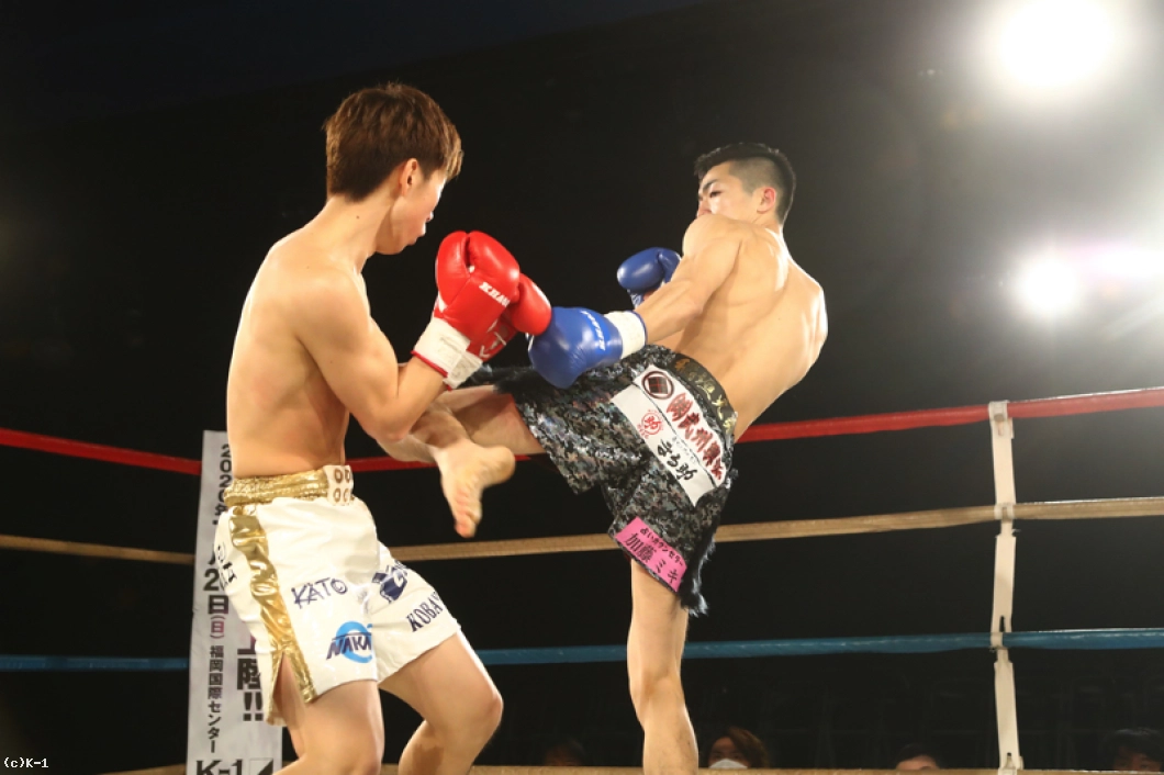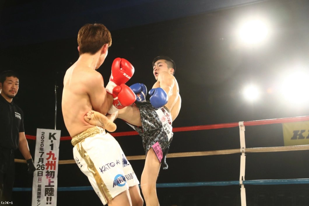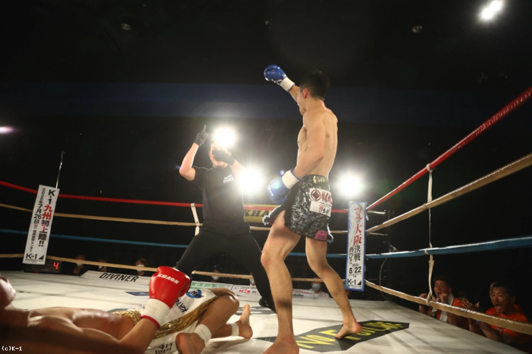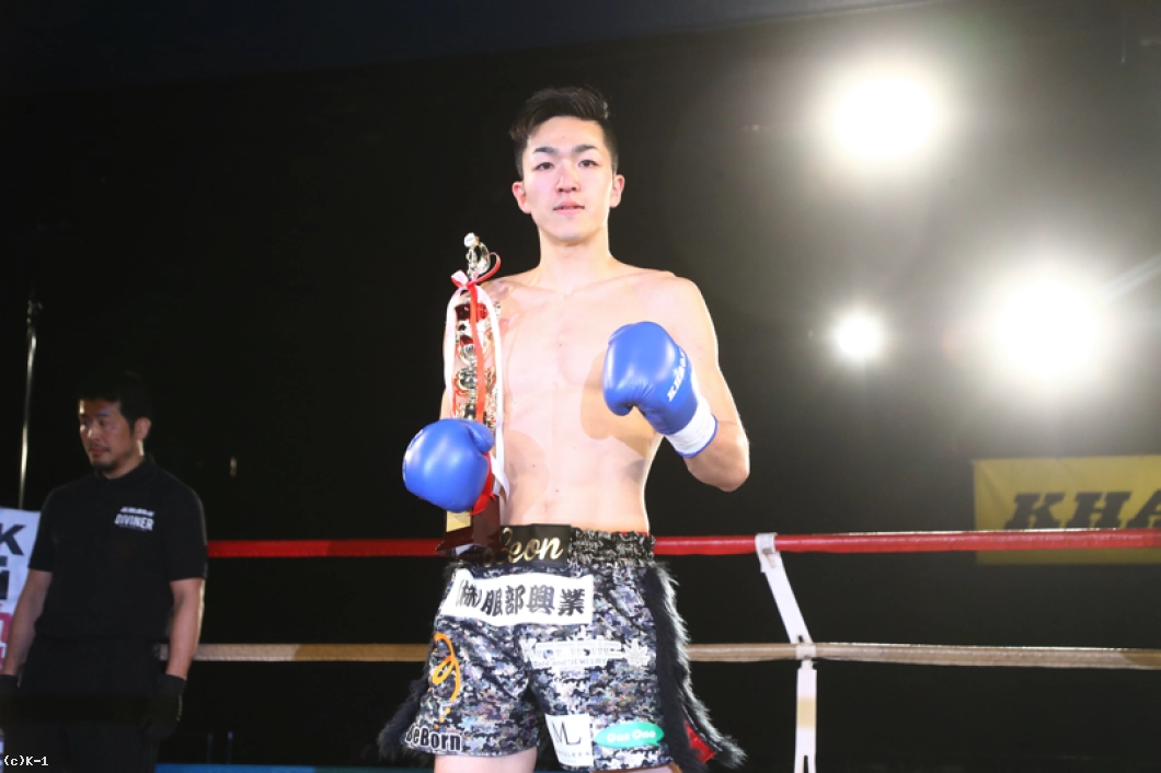 「山浦選手は右ローが得意な選手で、最初の右ローをしっかりカットできて練習してきたものが出せたと思います。あとは試合中に得意なヒザ蹴りを出すのを忘れていたところがあったので、それが反省点だったと思います。(代理戦争チームとしてあとがない状況だったが?)試合直前に古宮くんと『2人で勝って4勝3敗で終わろう』と話していたので、いい勝ち方で古宮くんにつなげられたと思います。(KO直前に左フックをもらってしまったが?)完全に見えないところで一発もらってしまって。普段から気にしていた顔の前のガードが出来ていなかったので、一発もらったことがすごく反省点です。KOできたんですけど反省点が多かったなと思います。(今後の目標は?)江川選手がKrushのベルトを返上して、Krushのトーナメントがあると思うので、そこに一歩踏み出せたと思います。KOで勝てたので、どんどん強い選手と戦いたいです。プロデビューしたからにはベルトを目指しているので、そこ(Krushフェザー級王座)は目指しています」