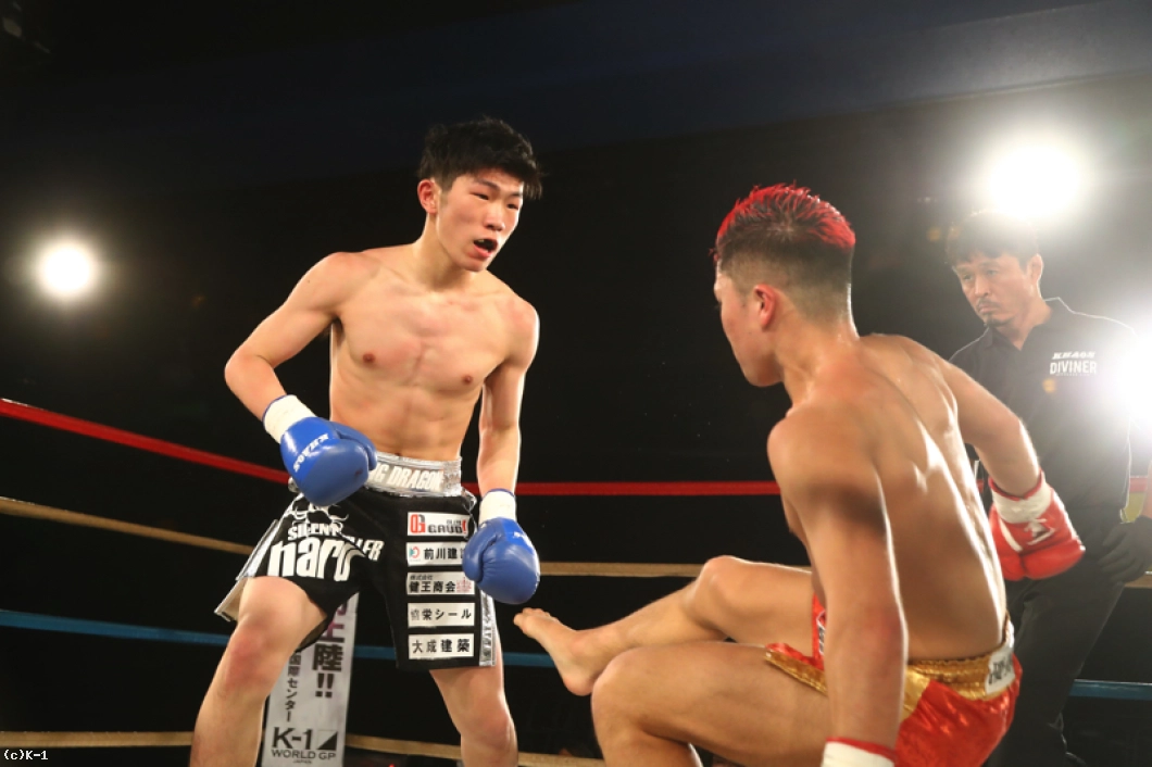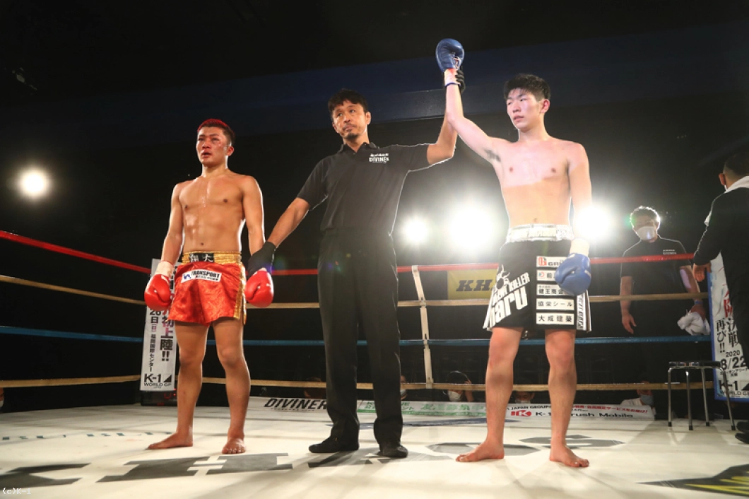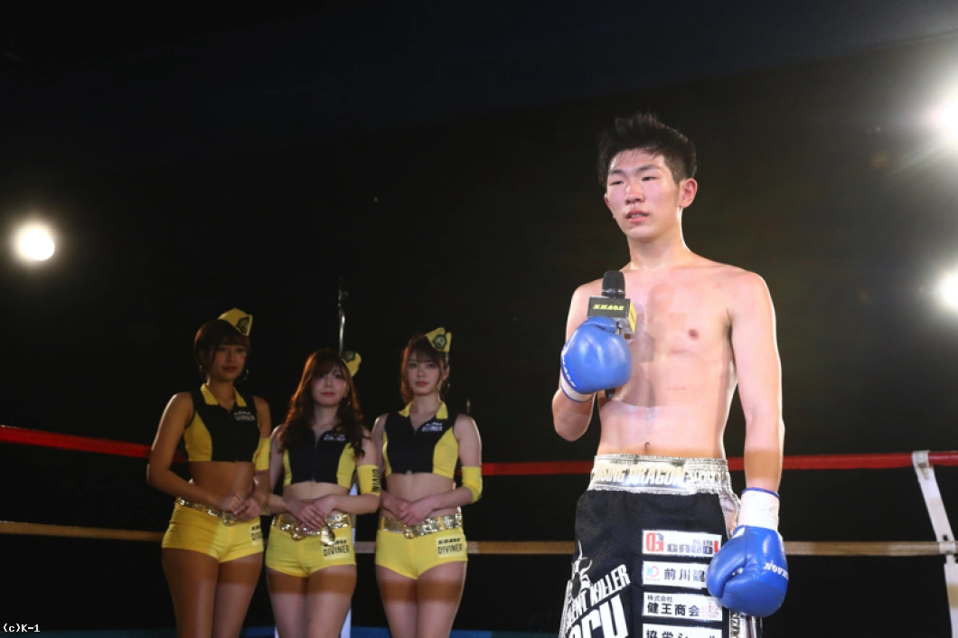 「3勝3敗で自分の試合が巡ってきて、いい試合をしていい大会で締めたいと思ったんですけど、自分の苦手な戦い方をしてしまって悔しいです。勝てたことはうれしいですが、反省しないといけないなという試合でした。(具体的にどこがよくなかった?)相手がサウスポーなんで左に回って蹴る、動きながら重たいパンチを当てつつカウンターを一発当てる作戦だったんですけど、実際は足を止めてガードも空いたまま打ち合ってました(苦笑)。0点の試合だったんで悔しいです。(試合中に何度かマウスピースが飛んでいたが?)初めてマウスピースを作ったんですけど型が合ってなかったです(苦笑)。作り直します。(代理戦争としての勝利について)僕は格闘代理戦争という企画で人生が変わって、その代理戦争の代表としてメインイベントという大事な試合に出してもらったことは誇りに思います。(今後の目標は?)今回は0点の試合だったんで、自分らしい距離を取って倒せるファイターになっていきたいです。(同じ難聴の境遇の方にどんなものを与えたい?)障害を持っている大人の方が色々と苦労したり、夢を持てない子たちがいたり…そういう話を聞きまし。僕がこういう舞台で輝いて、頑張ればここまでできるという夢や元気を与えられる選手になりたいです」