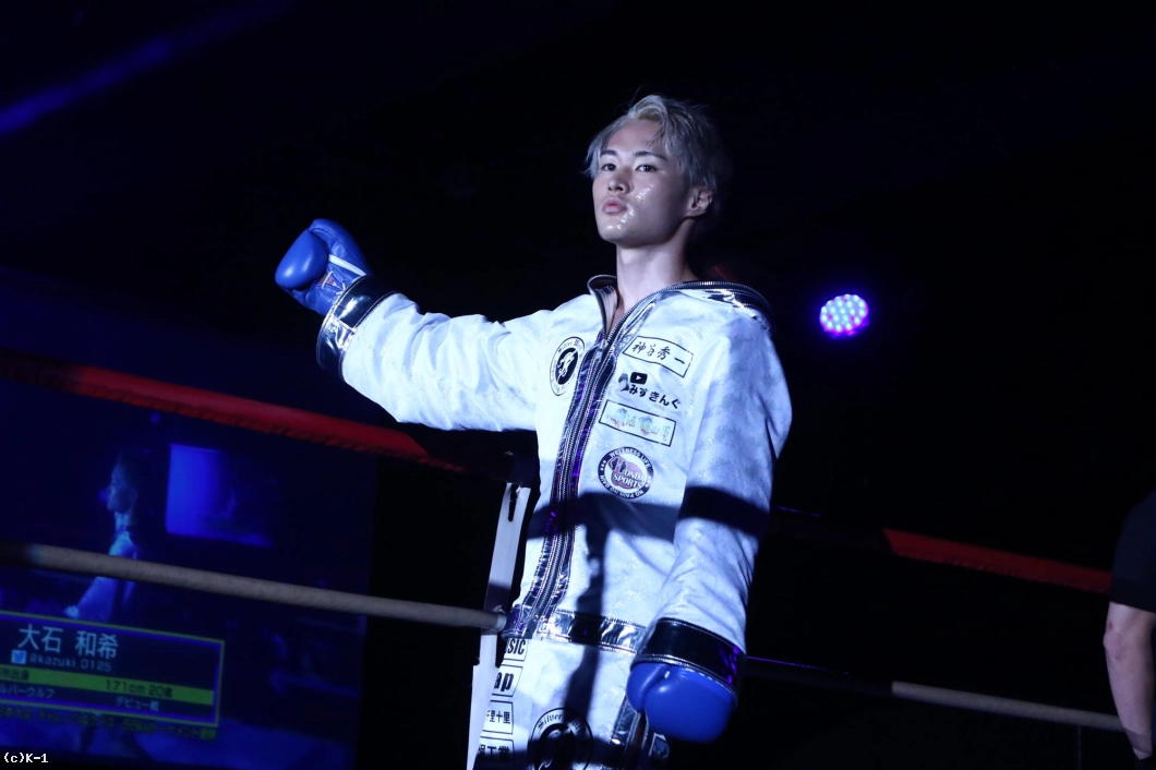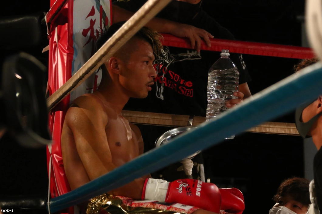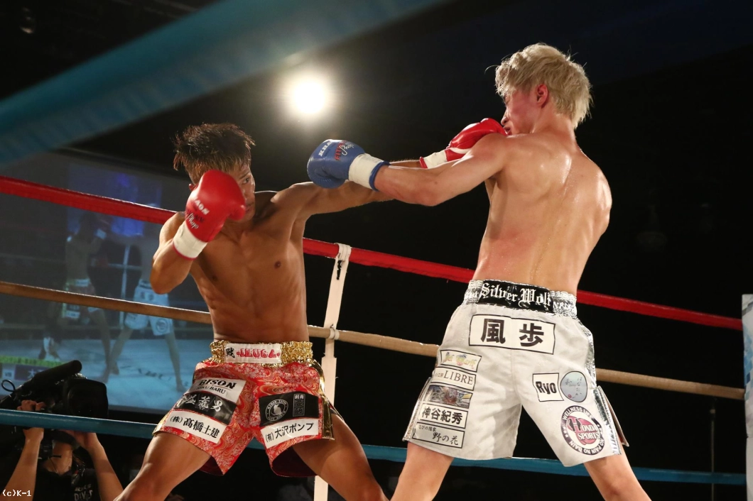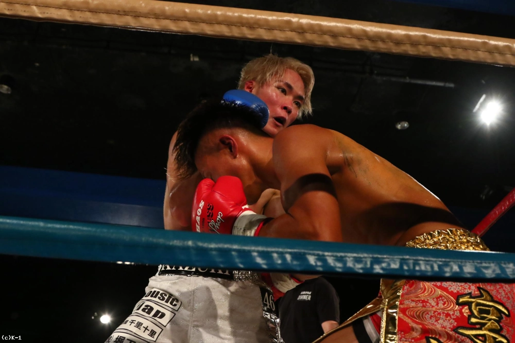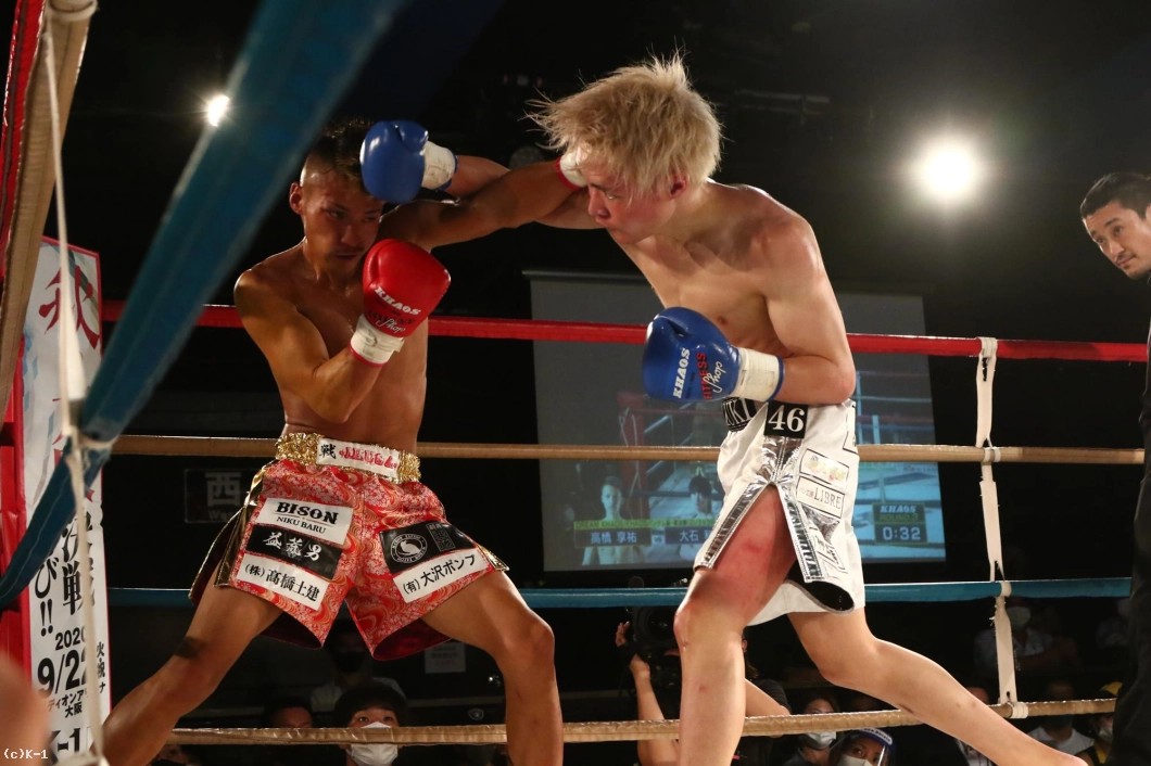 2R、ジリジリとプレッシャーを掛けんとする大石だが、高橋もそこへ左右のフックを強振。大石を懐に入らせない。高橋は前蹴り・右ローを当てて大石の前進をストップ。しかし大石が高橋にロープを背負わせて左右のフックをヒットさせる。