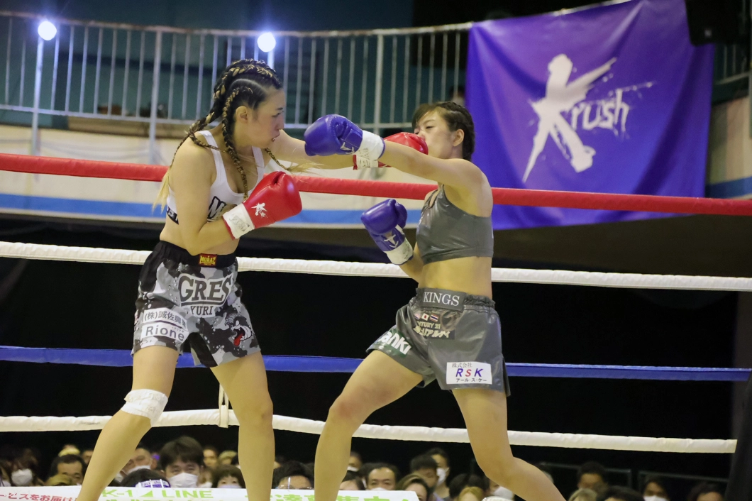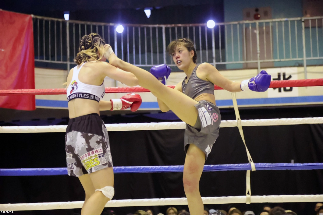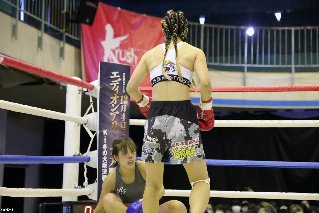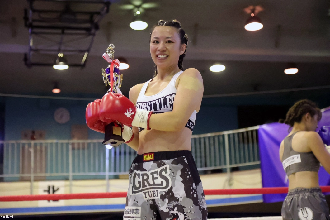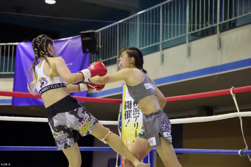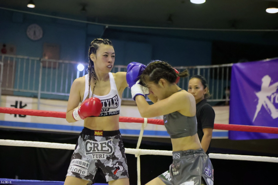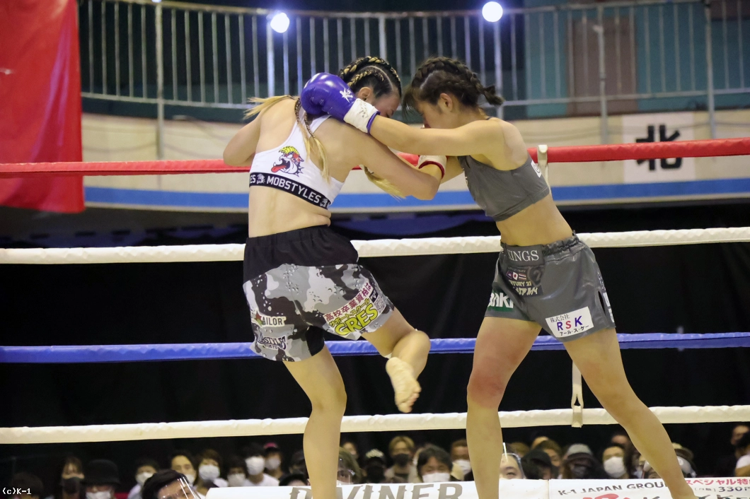「今回は過去に戦っていて勝っている相手だったんですけど、前回は延長でギリギリ勝てたので。今回はダウンを取れて圧勝できたところがよかったです。(前回の対戦との違いは?)サウスポー対策をしてきたので、それが練習通りに出た結果かなと思います。(今後の目標は?)Kアトム級のベルトも欲しいんですけど、K-1の大きな舞台に立って、華やか女子選手より派手な試合をして客席を盛り上げるような試合をしたいと思います」
