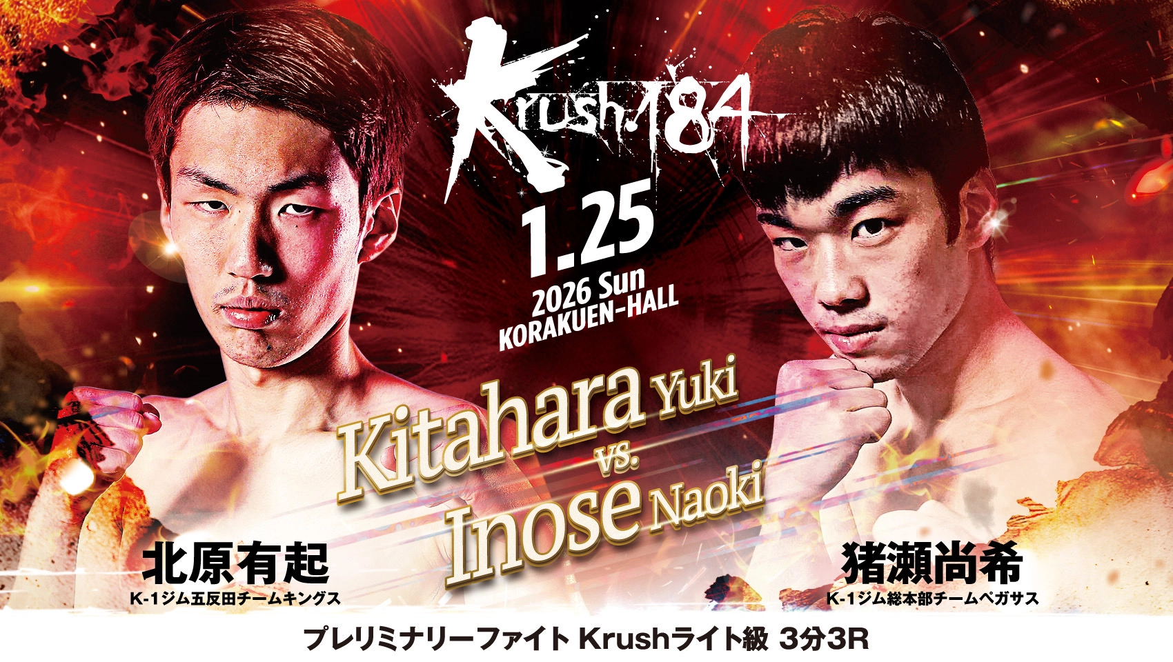 1月25日(日)後楽園ホールにて開催される「Krush.184」の[プレリミナリーファイト/Krushライト級/3分3R]で対戦する北原有起vs猪瀬尚希のコメントを公開!
