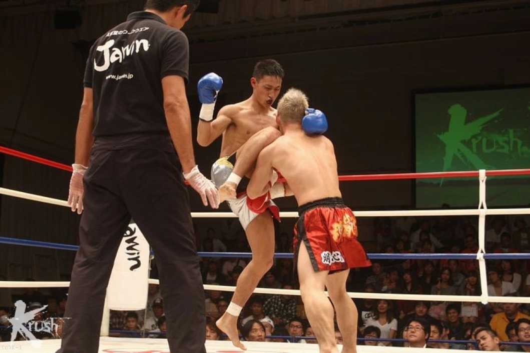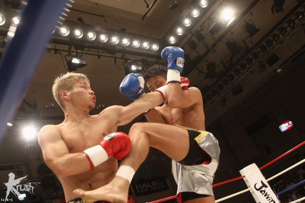 2R、翔也が距離を詰めて左ボディ、伊藤はヒザ蹴りで迎え撃つ。距離を潰して顔面とボディにパンチをまとめてハイキックを蹴る翔也。伊藤も顔面とボディにヒザ蹴りを突き刺して前進。翔也のパンチVS伊藤のヒザ蹴りという展開が続く。