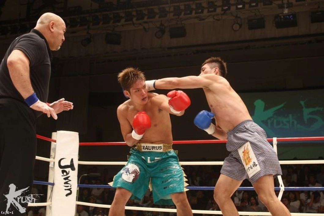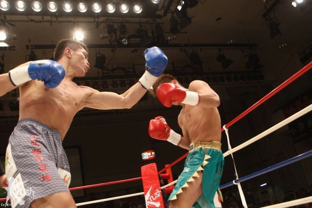 2R、藤田が阿佐美をロープに詰めてボディブローと右ロー。阿佐美も右ローを返して譲らない。圧力をかけて前に出る藤田。阿佐美は左フックとヒザ蹴りを返し、終了間際、右ストレートから返しの左フックでダウンを奪う。