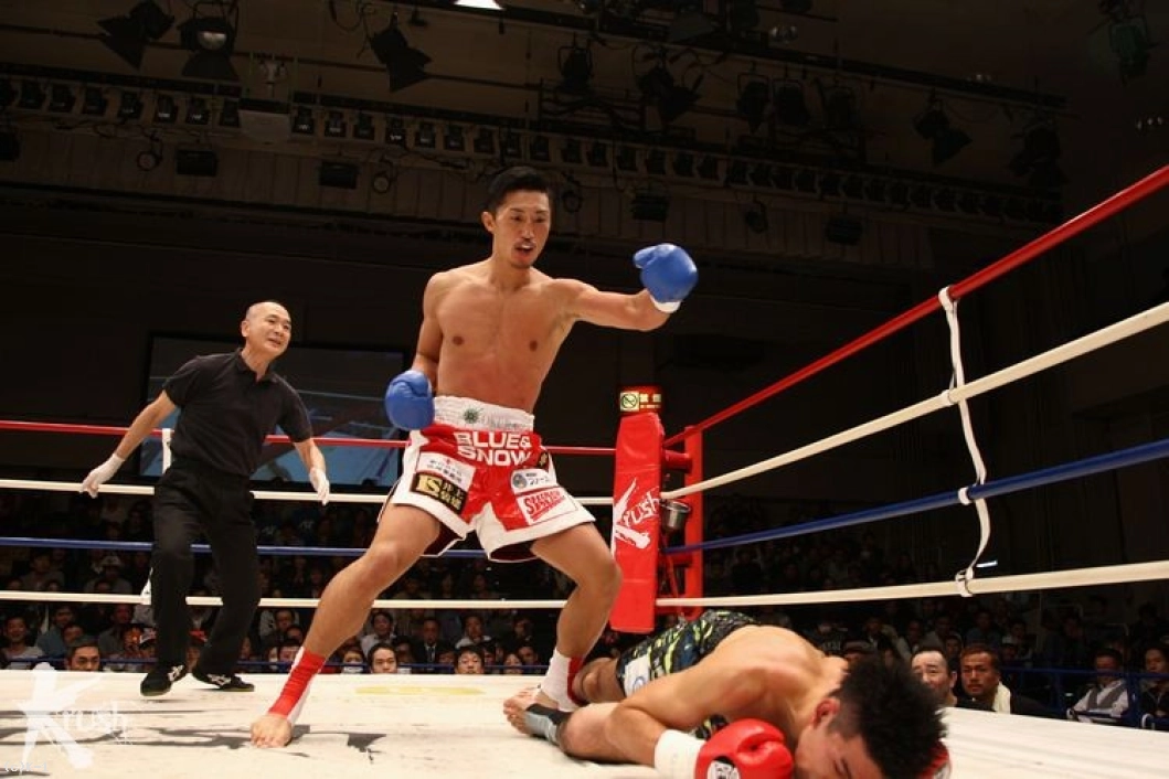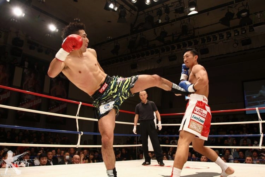 1R、前後にステップして左ミドルを蹴る山崎。NOMANもしっかりガードを上げて右ローを蹴り返す。山崎は左の蹴りを見せながら右フック、バックブローを繰り出す。NOMANは右ストレートから左ミドル、距離が開くと右ローを蹴る。山崎は下がりながらバックスピンキック、回転の技をフェイントを入れつつ、右ストレートと左アッパー。下がるNOMANに右フックを叩きつけてダウンを奪う。