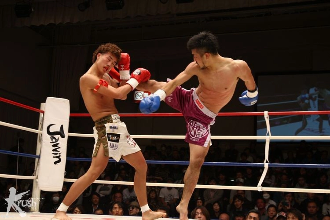 2R、青木がパンチで前に出ていくと、佐野がタイミングよく右ストレートを打ち抜いてダウンを奪う。再開後、青木はパンチの手数を増やすが、佐野はボディへのヒザ蹴りとロー、左ボディ・左フックを当てる。