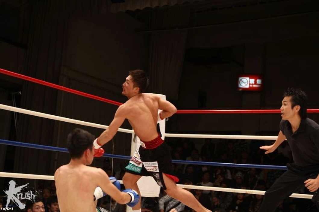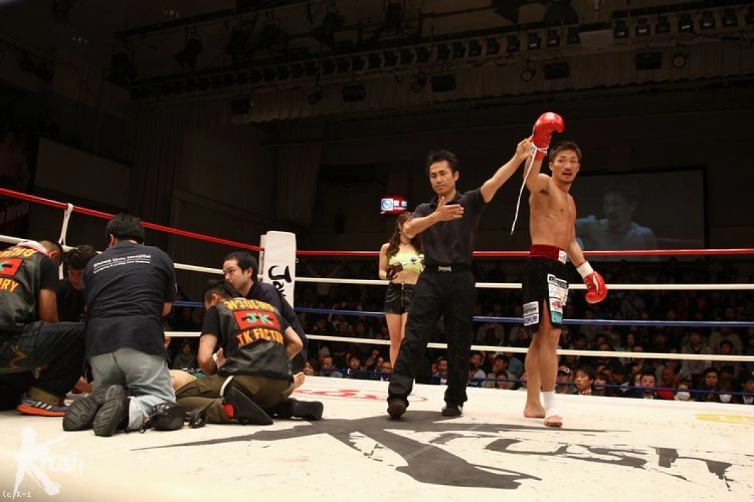 「(試合は覚えてますか?)覚えてます。自分が倒れたなっていうのと。時間はどのくらいですか?(1分半くらいです)まあ、一瞬だったなという感じで。記憶が飛んでるからだと思うんですけど。(最初にダウンをもらってからの逆転KOですが?)そうですね。でも、(倒れるのは)どっちかなとは思っていて。相手選手も蹴りがうまい選手だったので。蹴りは見えてたんですけど、倒しあいになると思ってたので。こっちが倒れても、撃ち合いに来てくれたので、たまたま一発が当たって。ホント、ラッキーパンチだと思うんですけど、正直、この一発のためにがんばってきたじゃないですけど、練習を積んできたので、この試合で出せてよかったです。