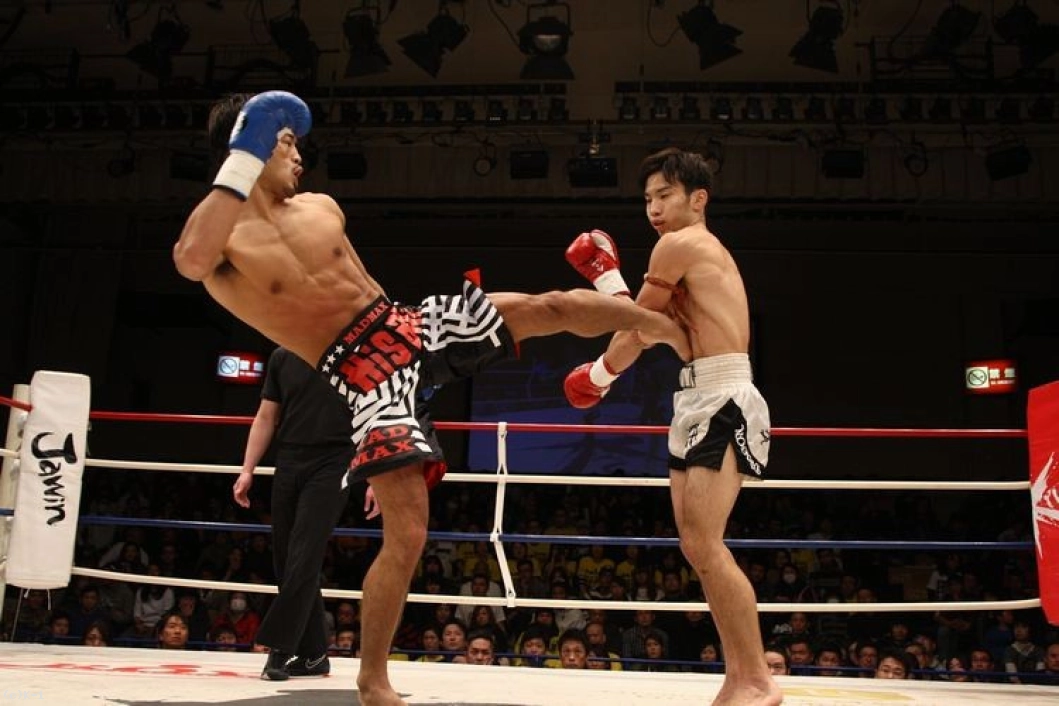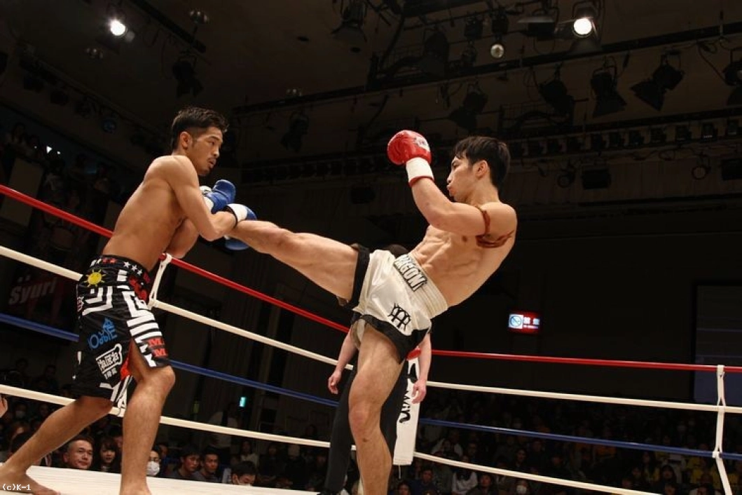 1R、サウスポーの東本に対して佐々木は右ミドルを蹴る。東本も左ミドル・インローを蹴り返し、互いに間合いを測って蹴り合う展開が続く。残り10秒、東本がパンチを見せたところに佐々木が右ハイキックを蹴る。