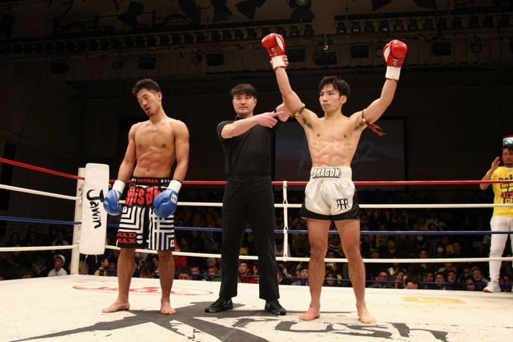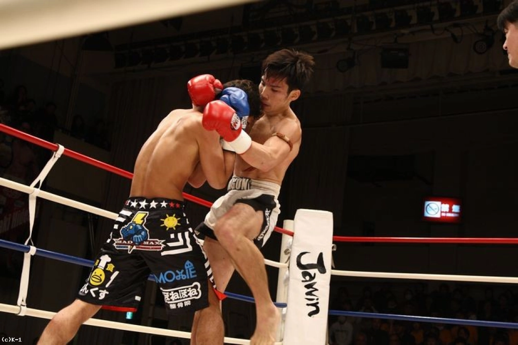 3R、左ミドルを蹴ってパンチをまとめる東本。佐々木も右ミドルを蹴って前に出ていく。東本が左ストレートで飛び込むと、佐々木は飛びヒザ蹴り。東本は距離を取って左ミドル、佐々木は右ストレートからヒザ蹴りにつなげる。残り10秒、佐々木が左ミドルを蹴り、東本がパンチを返す展開で試合終了。判定は2-0で佐々木が僅差の勝利を収めた。