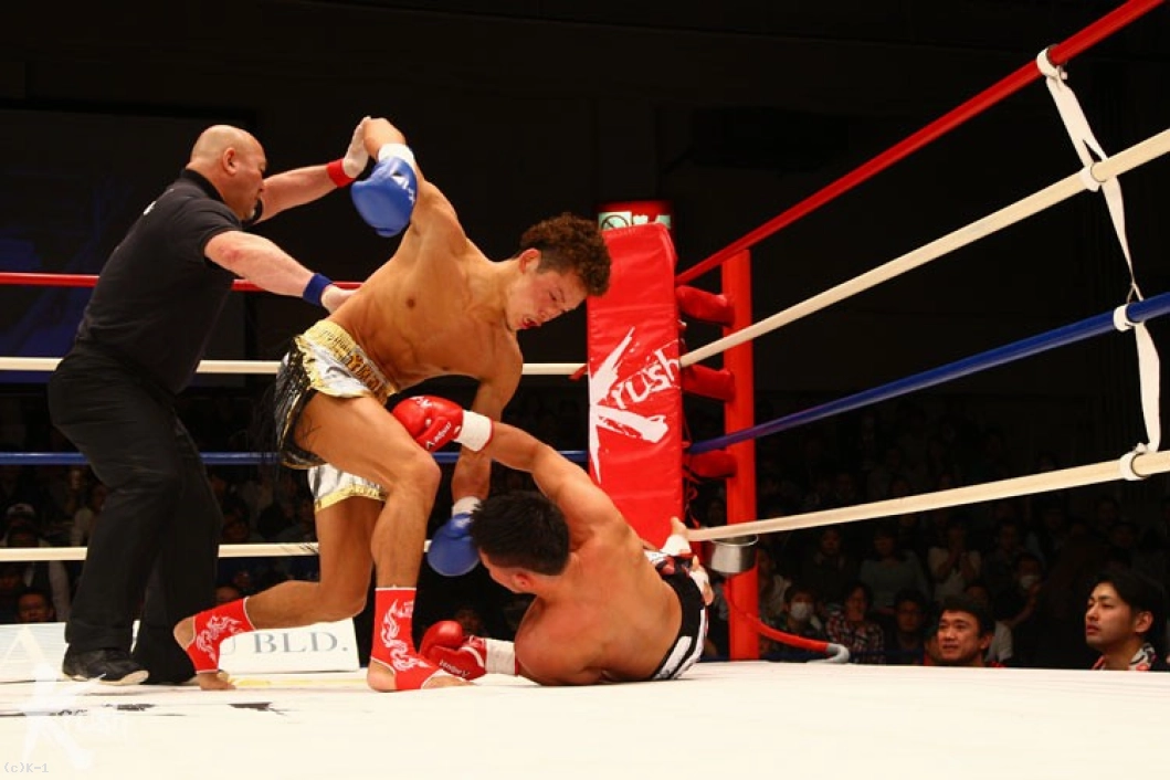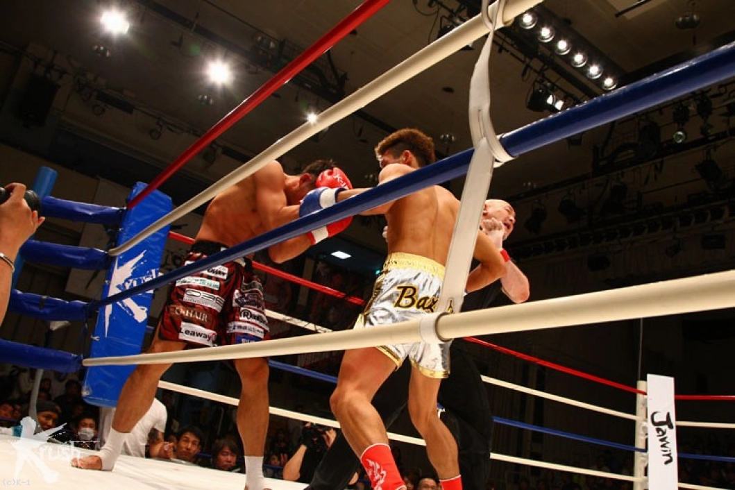 2R、両者まずは蹴りの間合いで、ロー・ミドルを蹴り合い様子を見る。そこからスッと踏み込んだバズーカは右フックを打ち込んで眞暢をフラつかせ、眞暢がこの後で打ち合いに来ると、この右フックをさらに連打で決めスタンディングダウンを奪う。ファイティングポーズを取り戦闘再開に臨む眞暢だが、ダメージが感じられバズーカが左右フックを送って2度目のダウンを奪取。さらに向かった眞暢は右ストレート、左フックを打ち込んだもの、回転力で勝るバズーカが左右のフックを巻き込むように浴びせ3度目のダウンを奪って勝利した。