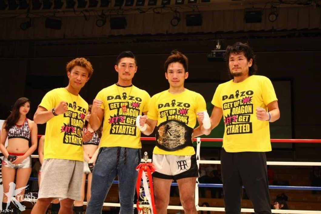 佐々木 第4代-63㎏級王者の佐々木大蔵です。セコンドについてくれた秀さんの次にこのベルトを巻けて嬉しいです。重みを感じます。僕は格闘技はいじめに出会って始めて、チャンピオンとかは思わず、強くなりたい一心でしたが、前田先生に「強くなろう」って言われて、先輩がプロになればプロになりたい、チャンピオンになればチャンピオンになりたい、そうやって追いかけて、夢を抱いてここまで来ました。本当に続けてこられてよかったですチームドラゴンじゃなかったらこのベルトは巻くことができませんでした。この機会を逃したらやめようと思って臨みましたが、また夢ができました。龍児さん、トーマス選手、秀さんが輝かしたベルトをさらに輝かしたい。泣き虫ですけど、これからは堂々とチャンピオンとして取り組んでいくので、今後とも佐々木大蔵とチームドラゴンをよろしくお願いします」