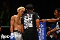 EXR、瑠輝也の左アッパーに岩崎は左フックをカウンター。しかしやや圧力が落ちたかの岩崎に対し瑠輝也はリーチを活かして左右ストレート、左ボディ、左ヒザと打ち込む。瑠輝也が左三日月蹴りをヒットさせると岩崎はガードがややボディに集まってくる。それでも岩崎はハイキックをヒットさせ、瑠輝也にマウスピースを吐き出させる。さらにボディを攻める瑠輝也に対し、岩崎もボディへのヒザを連発して終える。