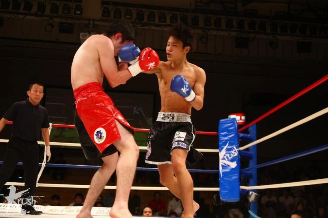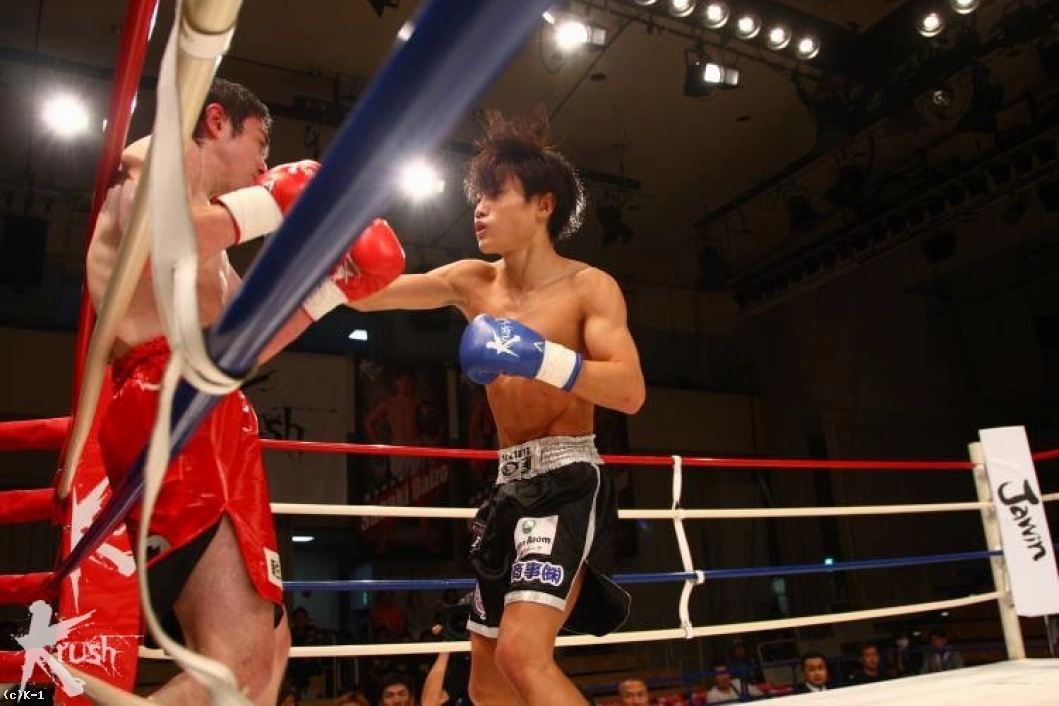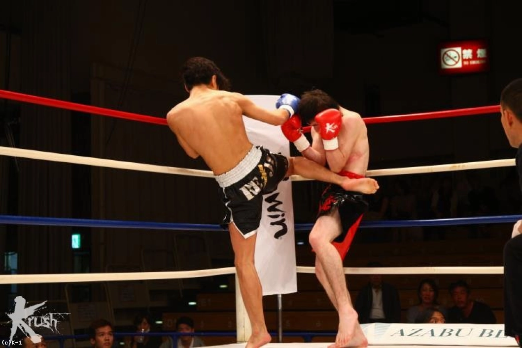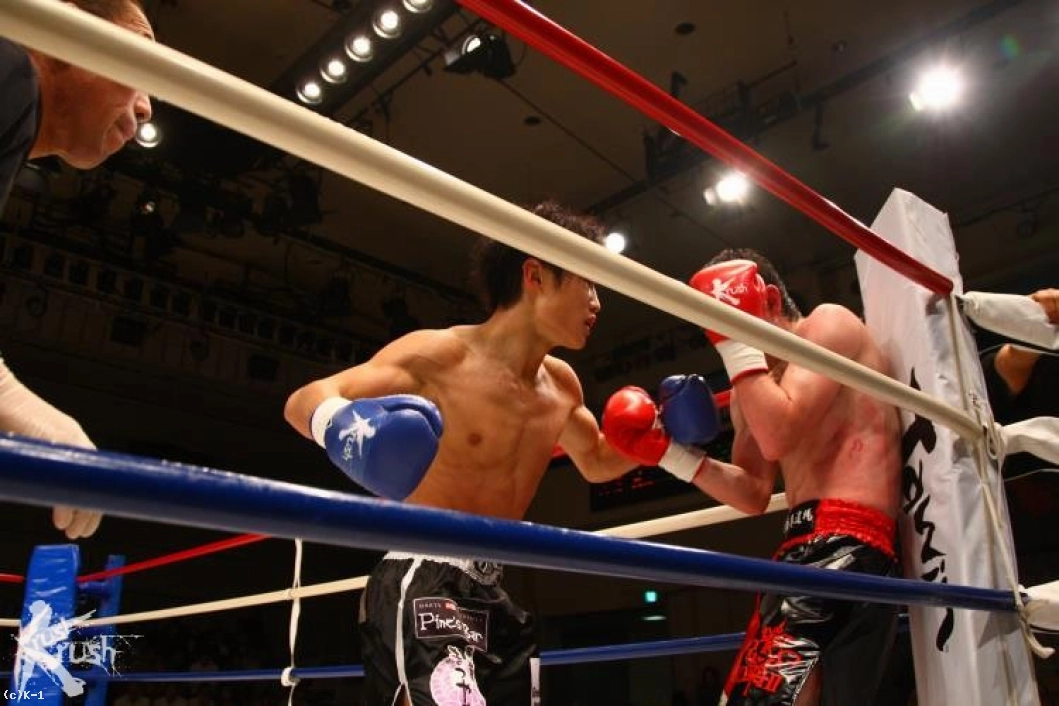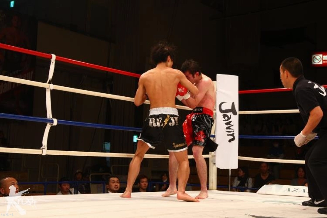 2R、変わらず手数では笠見が上回るが、ラッセルはブロックでこのパンチを弾きながら前に出て右ローキック。笠見はワンツー、右ストレート、右アッパーと振るうがラッセルは前に来る。しかし笠見が左フック、右アッパー、右ミドルと攻撃をまとめる場面ではラッセルも後退を余儀なくされる。