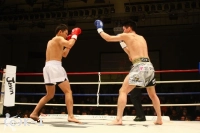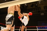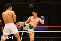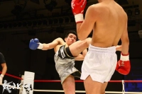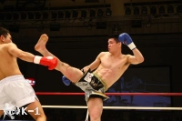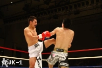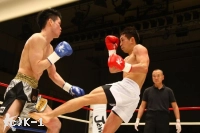 2R、山本は左インローのヒットから出ていかんとするが、加藤はそこへ右ストレートを送って止める。ハイキックを繰り出し、加藤がリターンしたハイキックもよく見てブロックする山本だが、攻めて出る機会を見出せない。山本のローに加藤は右ミドルで応戦する。