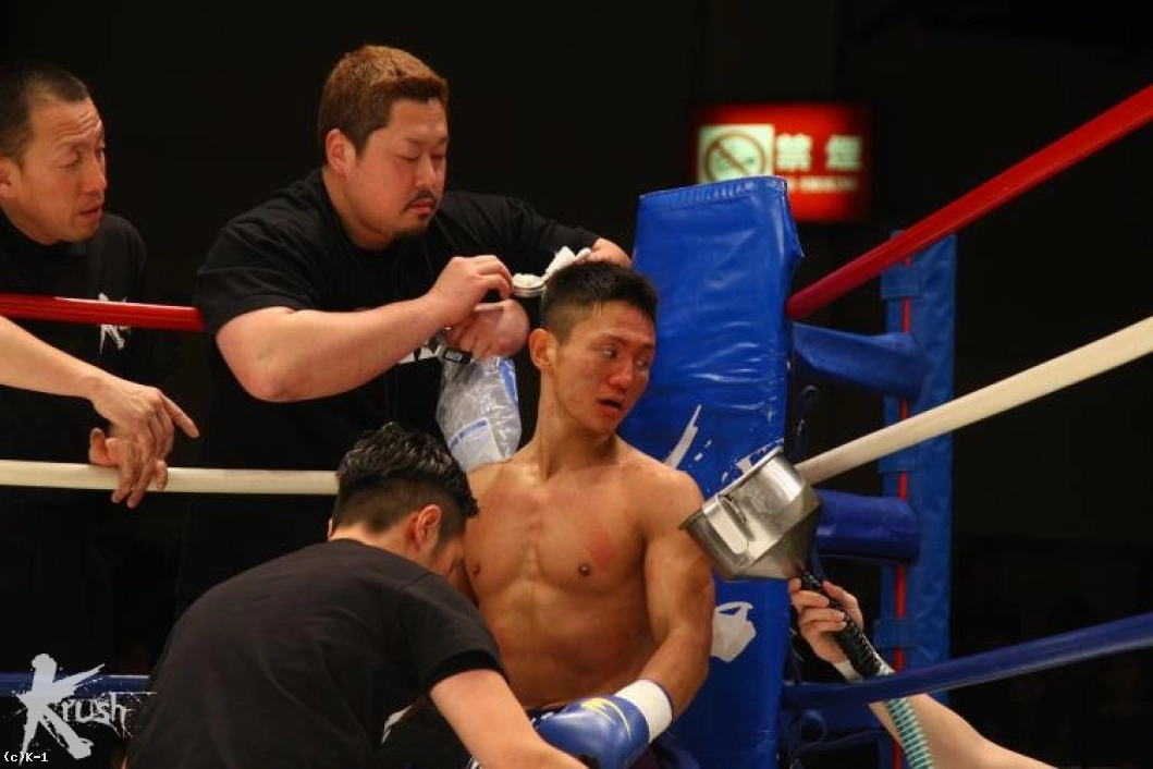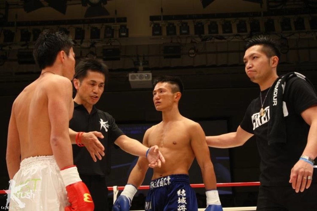 3R、不退転ともいうべき覚悟を感じさせる結城は右ストレート、スーパーマンパンチと体格に勝る石田が前に来ても応戦。石田は後ろ回し蹴りをボディに打ち込み、これでやや結城が怯むとロープに詰めてラッシュする。ラウンド終盤は両者やはり激しい打ち合いとなり、馬力で勝る石田が押して結城を下がらせていくが、結城も右ストレートを中心に応戦して試合を終える。