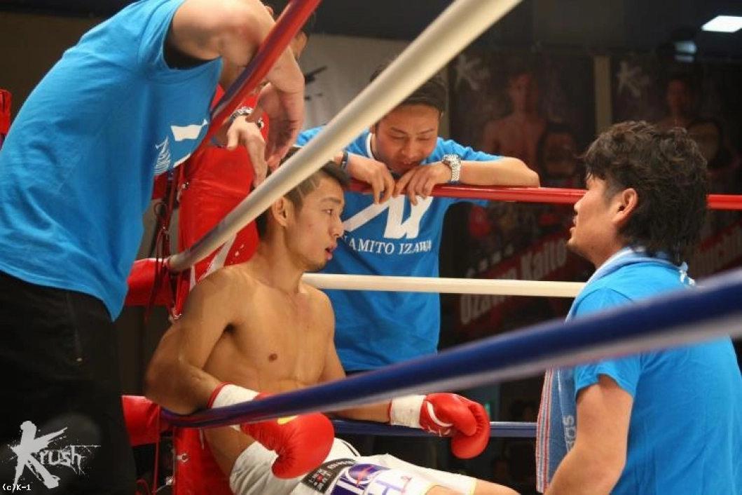 2R、良星の蹴りを見切ってかわしロープに詰めた伊澤は、ここで左フックから返した右フックを打ち込み良星はダウン。
