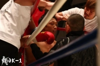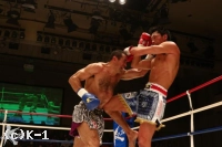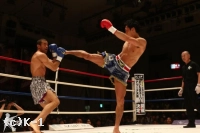 1R、モハンはゴングから跳び蹴りで襲い掛かり、塚越はこれに面食らうも前蹴りを送って勢いを押さえんとする。さらに腕を前に伸ばしてモハンの剛腕フックをディフェンスする。ボディにヒザを送る塚越だが、モハンはフックを振り回す。モハンはフックを振るい、その勢いで後ろ足が前に出ると、そのまま構わず逆構えになってパワフルなパンチを続行。
