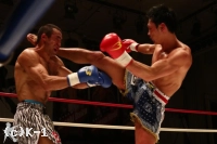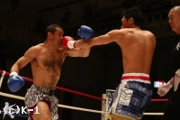 3R、モハンをロープ・コーナーに詰める塚越だが、モハンは追い詰められると底力を発揮し、右ストレート、左フックを放って前に出てくる。そして強振した右フックで塚越をとらえ、塚越は後退。塚越はボディへのヒザからハイキックに狙いをシフト。そしてモハンに右ストレートを突き刺す。モハンは後退していくが、まだ強打を持ち合わせているので塚越は警戒して詰めれない。
