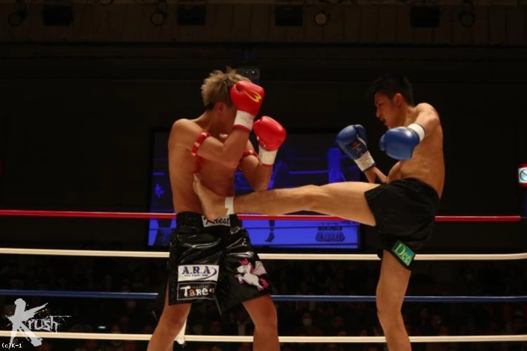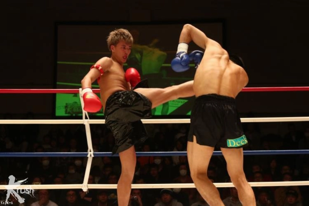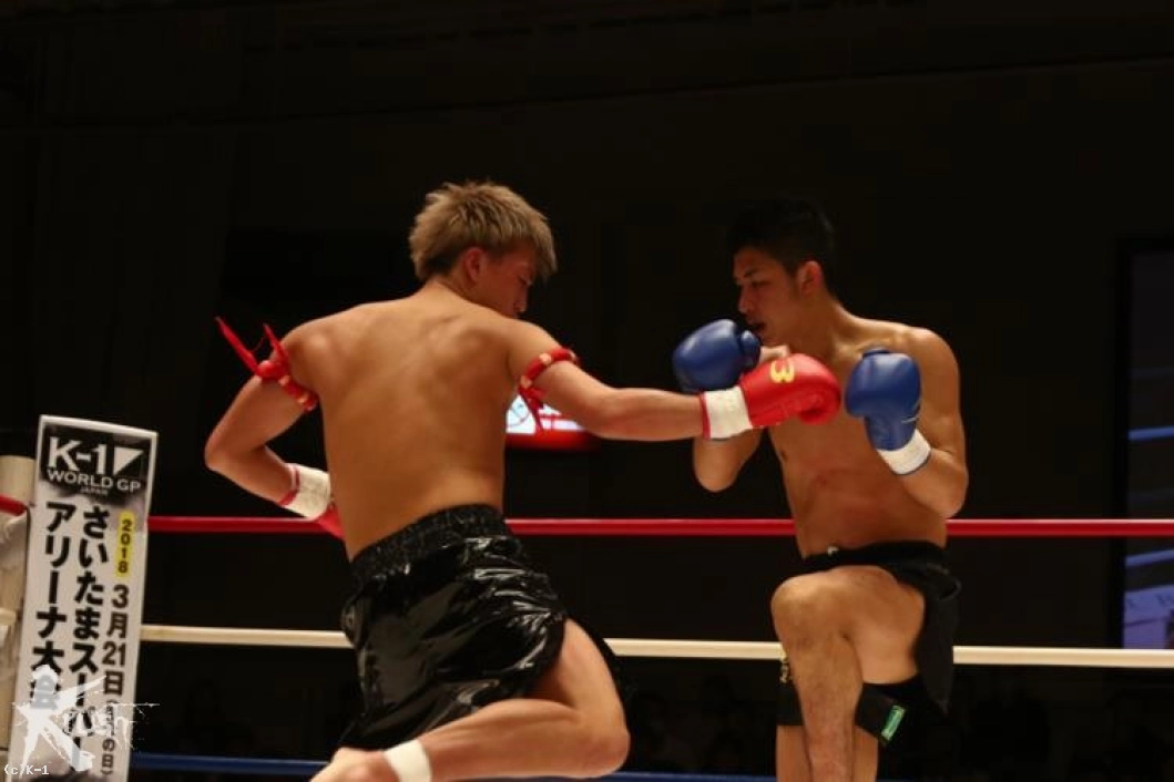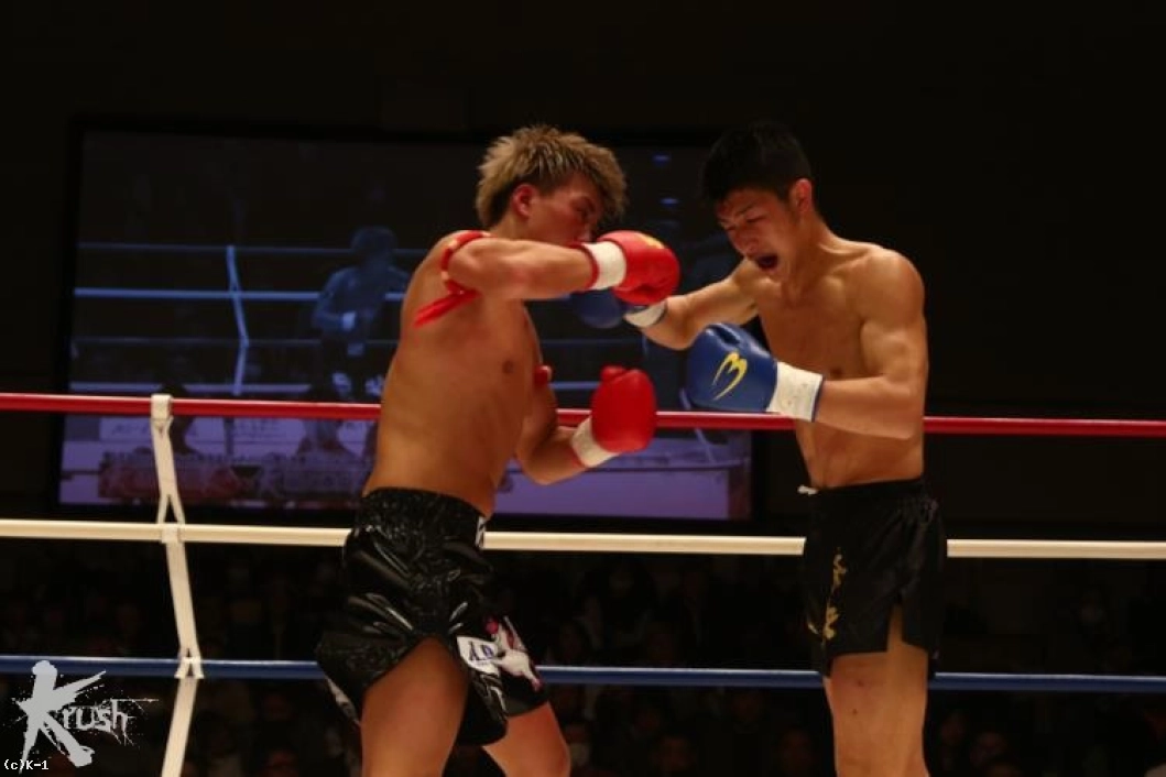 2R、接近して右ローを打ち込む佐野に対し、朝久は腕を真っすぐに伸ばして佐野から距離を作って左ストレート、右フックとパンチを打ち込む。佐野は被弾があっても圧力を発していき、右ローを打ち込む。朝久は右回りしてこのローに対処しながら左ストレート、右フック。佐野はタフさと圧力を見せ、打たれても前に出る。だが、朝久はこの前進を横にかわし、右フック・左フックと当てる。だが佐野もガードを交えて直撃では貰わない。