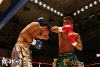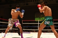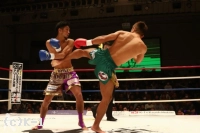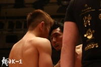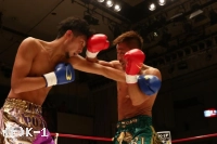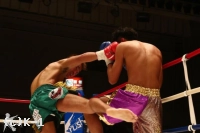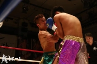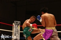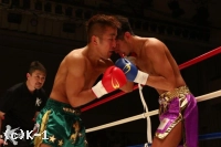 1R、181㎝と長身の松下は上背を活かして間合いを詰めると、小宮のボディにヒザ蹴りを集める。小宮が足を滑らせ転倒すると、松下は強気に上から見下ろす。両者は接近した距離で試合を展開し、小宮はボディストレート、右アッパーとパンチを打ち分ける。そして松下の顔にヒザも突き上げる。松下ははヒザを中心に応戦。小宮はしかしパンチの回転で上回り、右ローキックも松下に効かせる。