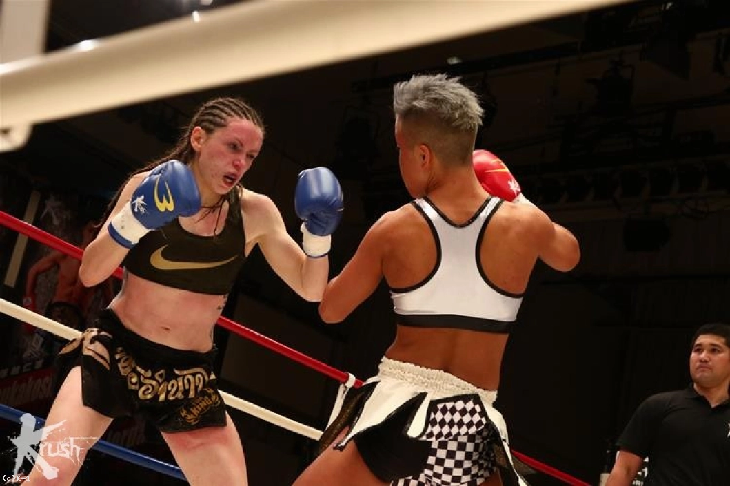 1R、身長で上回るグレイスにKANAは出入りのステップを使い、接近すると左右のフックをボディに連打してこれでグレイスを嫌がらせる。距離を取ってグレイスがストレートを伸ばしてきても、KANAはよく見えている印象で頭を振ってかわす。そして踏み込んでの左ボディフックをグレイスに突き刺し、そこから右ローに繋げる。足も嫌がり始めるグレイス。KANAはグレイスのジャブに右ストレート、左フックとパンチを合わせ始める。