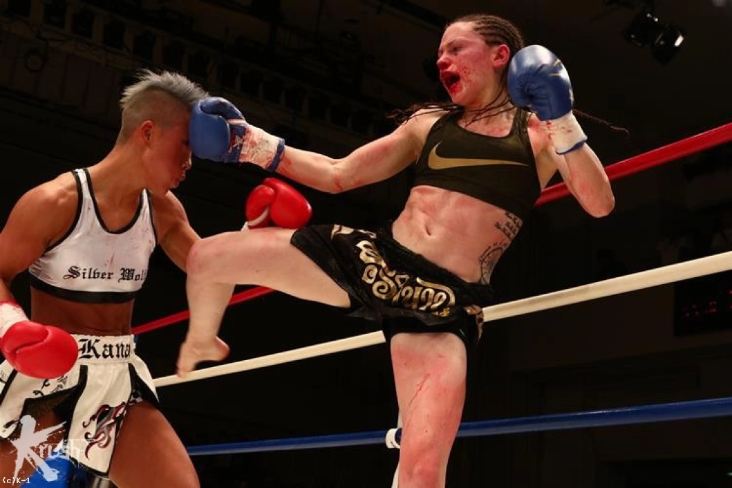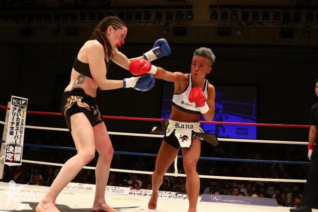 2R、KANAは顔面前蹴りを当て、グレイスに鼻血を呼ぶ。フットワークの軽快なKANAはグレイスのパンチを目先でかわし、右ローで足を殺していく。ここでグレイスの出血が激しくなり、ドクターチェックが実施される。再開するとKANAは左ボディフック、右ミドルとボディ攻めを忘れず、ジャブ・ストレートでもとらえてグレイスを再び出血させる。前蹴りを入れてグレイスを遠い間合いに下がらせ、パンチを見切ってかわすKANA。