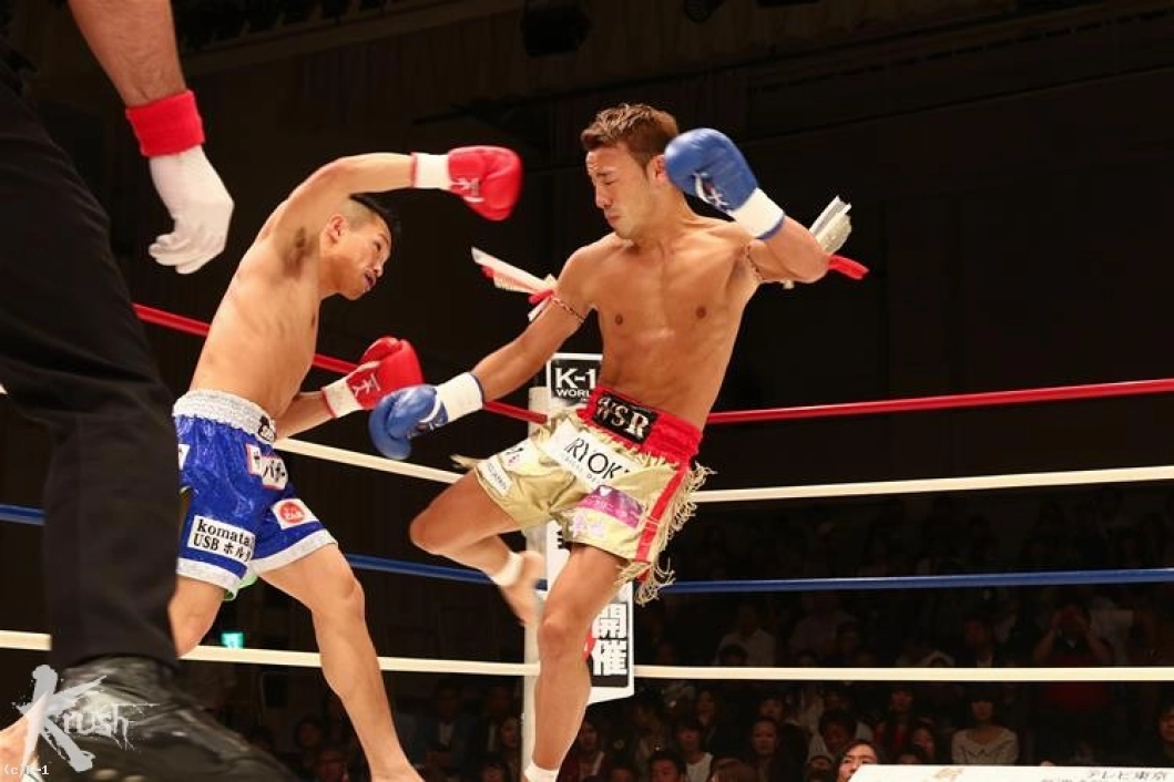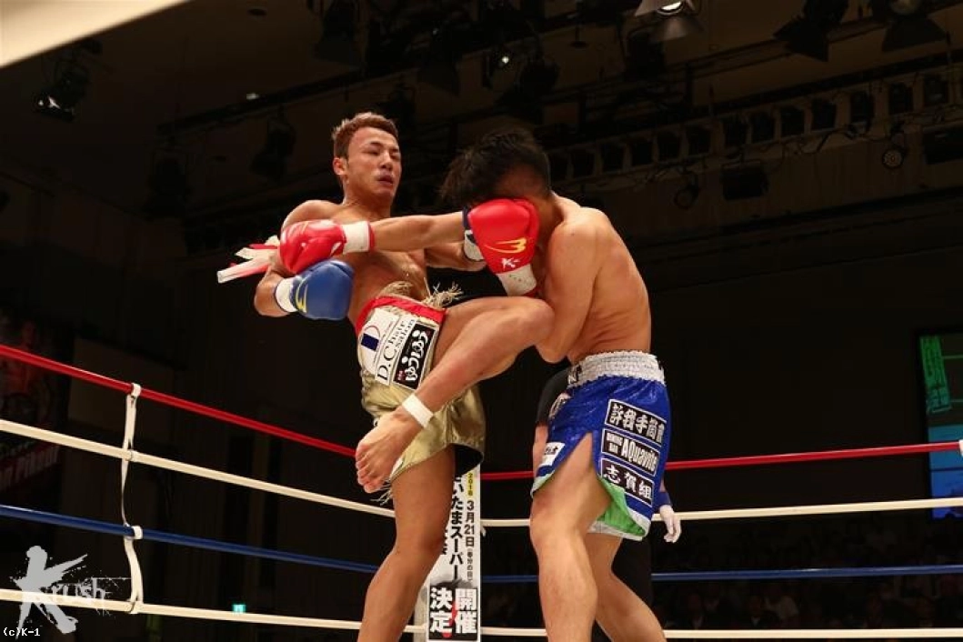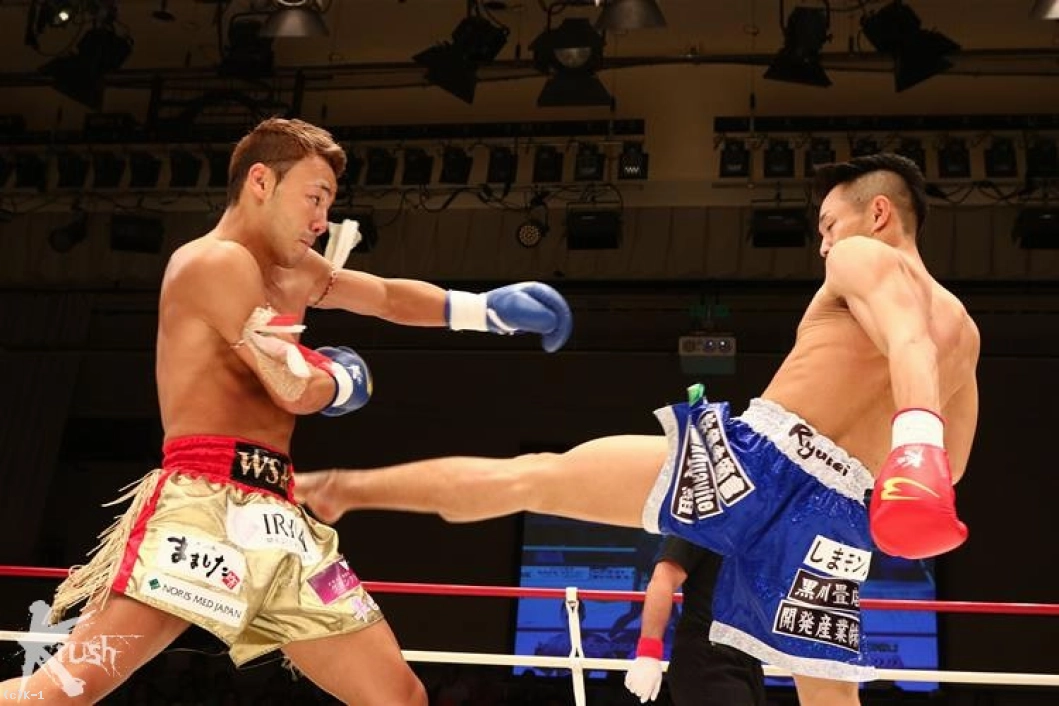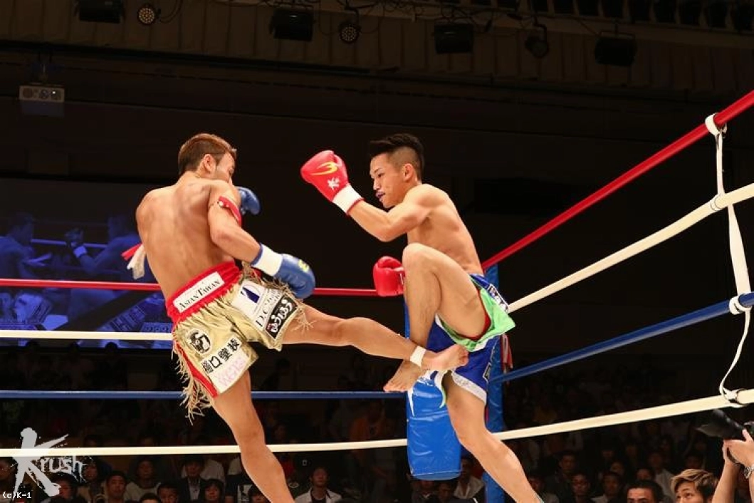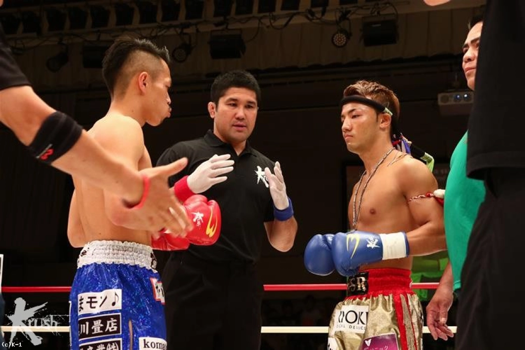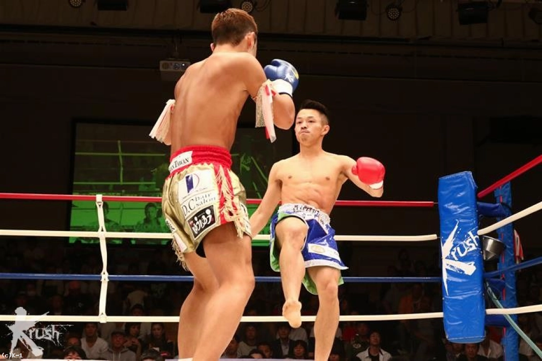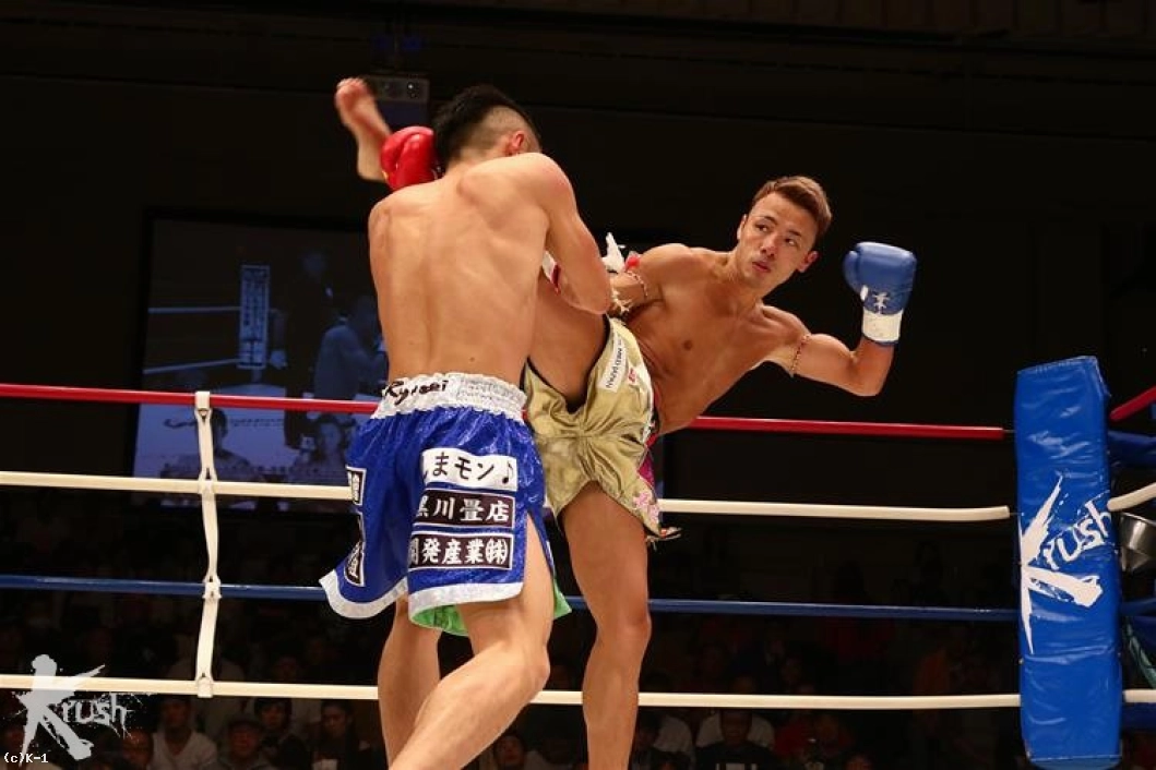 2R、コンパクトで速い隼也の左ミドルの切れ間を狙い、隆聖は跳び込まんとする。隼也が放ったバックブローをかわすと、両者は「やるな」とばかりお互い笑みを見せる。隆聖の跳びヒザに隼也もボディへのヒザを返すが、どちらもガードして当てさせない。隆聖は再びの跳びヒザから右ストレートをヒット。隼也が左ミドルを放てば、隆聖も右ハイを返すし、お互いまだ印象的な攻勢を作れない。