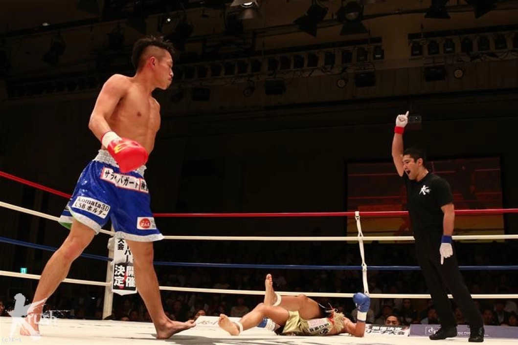 3R、開始すぐにパンチの交錯から隆聖は左ハイを当て、これに隼也はダウン。そして口から出血が見られドクターチェックとなるが、ここで試合はストップ。隆聖が王座決定戦への出場権を手に入れた。