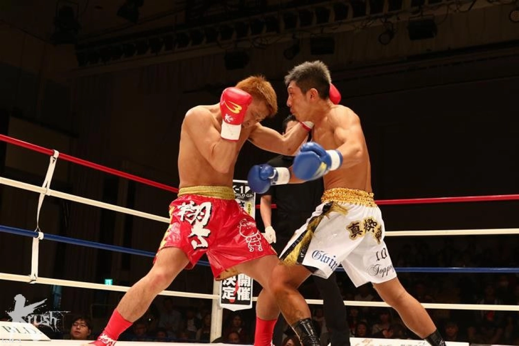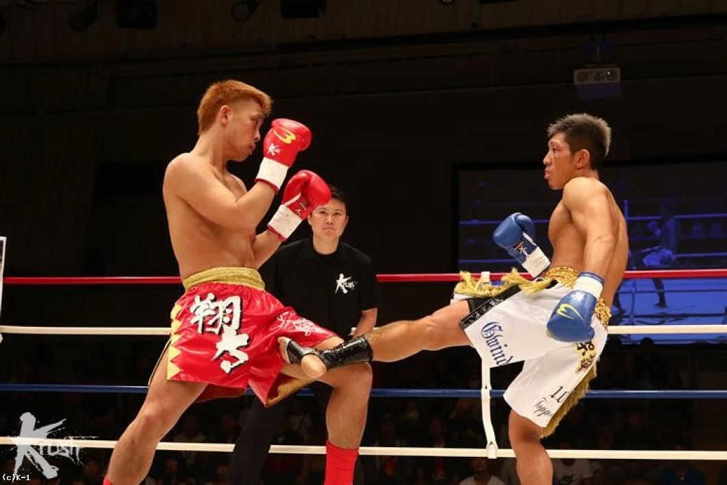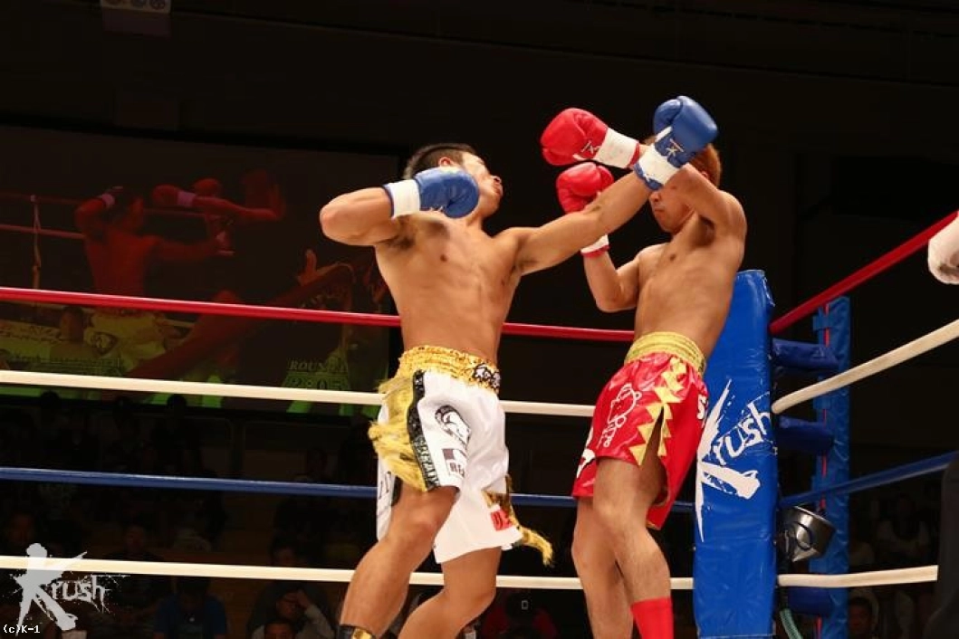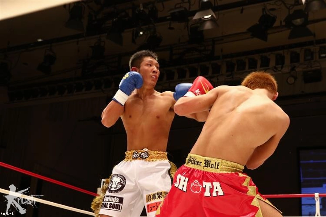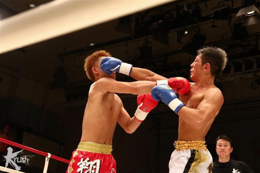 2R、上下にフックとストレートを振るうKAZUMUに対し、翔太はガードを注意して上げローを返す。しかし翔太が手を出してきたところでKAZUMUの左フックがカウンターとなりクリーンヒット。一瞬動きの止まった翔太だがダメージはさほどないか、打ち気のKAZUMUをプッシングで後方に崩し、ローキックを打ち込む。
