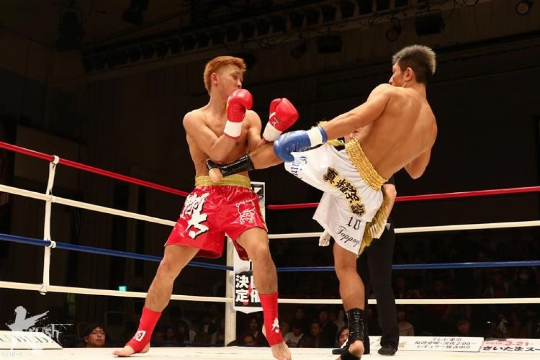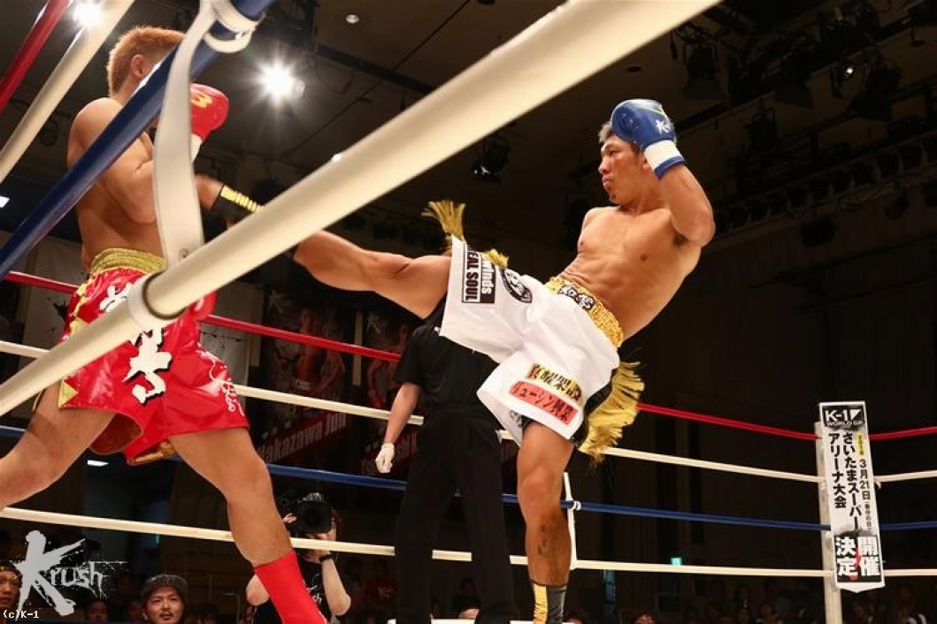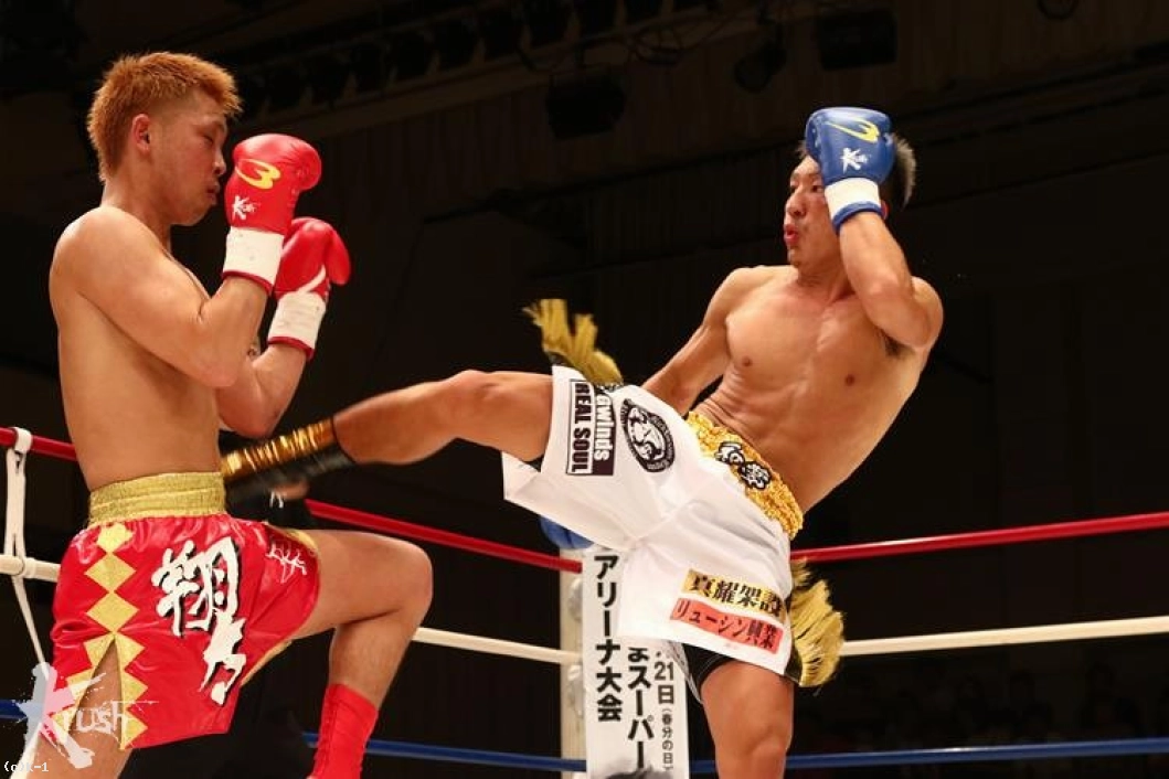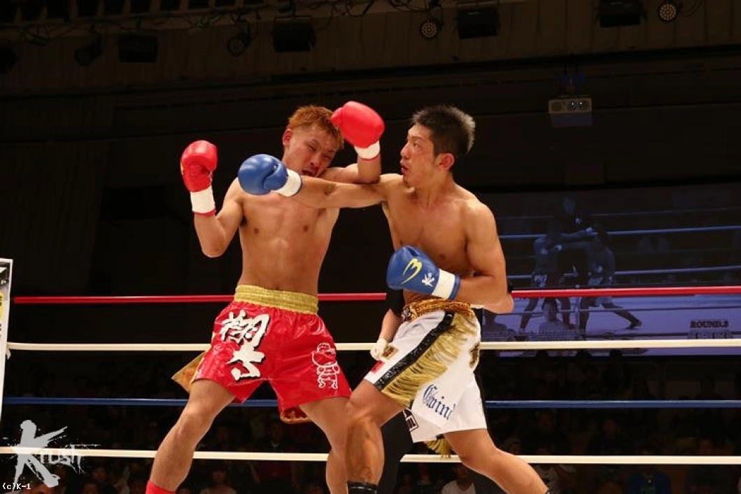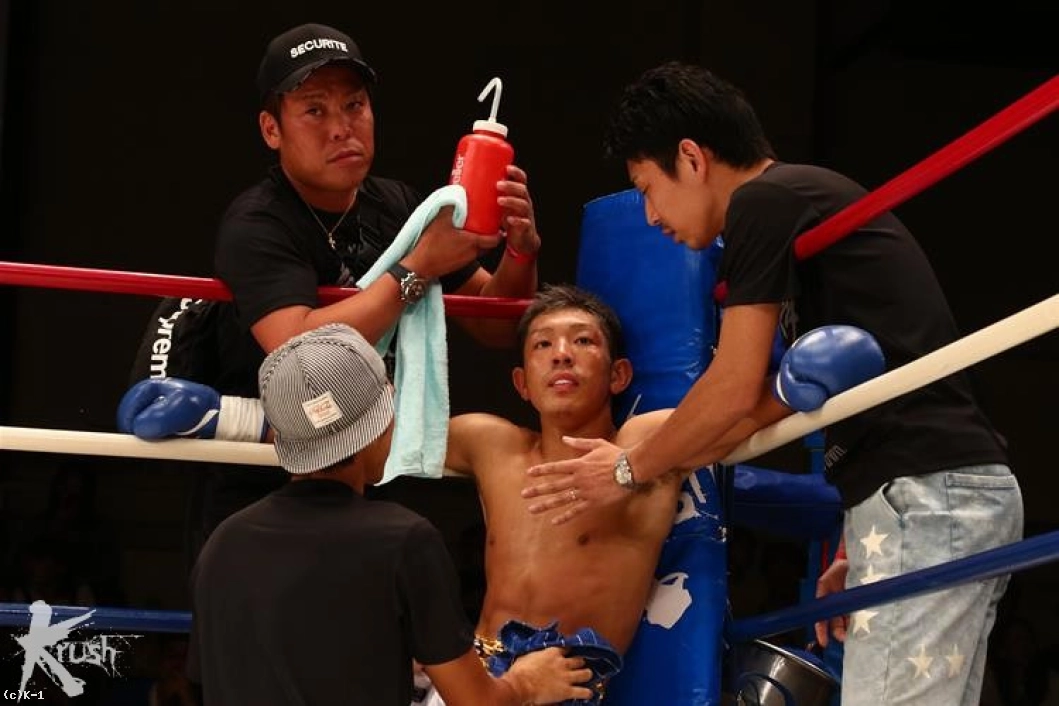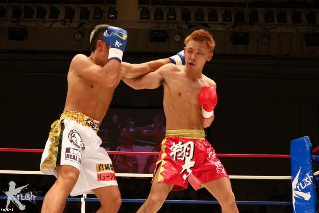 2R、上下にフックとストレートを振るうKAZUMUに対し、翔太はガードを注意して上げローを返す。しかし翔太が手を出してきたところでKAZUMUの左フックがカウンターとなりクリーンヒット。一瞬動きの止まった翔太だがダメージはさほどないか、打ち気のKAZUMUをプッシングで後方に崩し、ローキックを打ち込む。