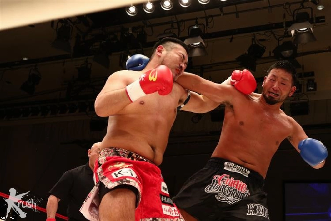 2R、KENは再び左フックと右ストレートで迫る。逆に訓が左右フックで出て来ると、その内側を抜いてKENはワンツーをヒット。打ち合いの場面となると、KENが精度で上回り、右ストレートで訓を打ち抜きダウンを奪取。立ち上がった訓は逆転へ向けフックをフルスイングするが、KENもやはりストレートで応戦して負けていない。