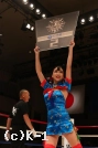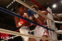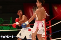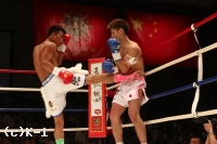 2R、里見は左ミドル、ボディへのヒザ、左ストレートと放ち、ワンが距離を詰めてパワフルな左右のフックを振るってくると、距離をあけてパンチを空転させる。