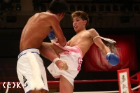 3R、里見はジャンプしての二段蹴り式ハイキックを見せ、再び距離を作ってワンにパンチの強打を振るわせない。そして左ミドルを連打。