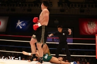 3R、ジェンリャンはフックに力を込めて、ボディ・顔面と走らせる。小宮はこれを組んで押さえんとしてしまい、レフェリーに注意を受け、この累積で警告を受ける。