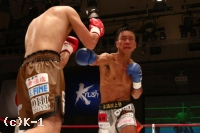 2R、恭士郎は歩きながら前進ベースの戦いで、青津のジャブ・ストレートをガードで弾いて下がらない。そこから左ボディフック・ストレートとパンチをまとめ、さらにローキックへ繋げる。