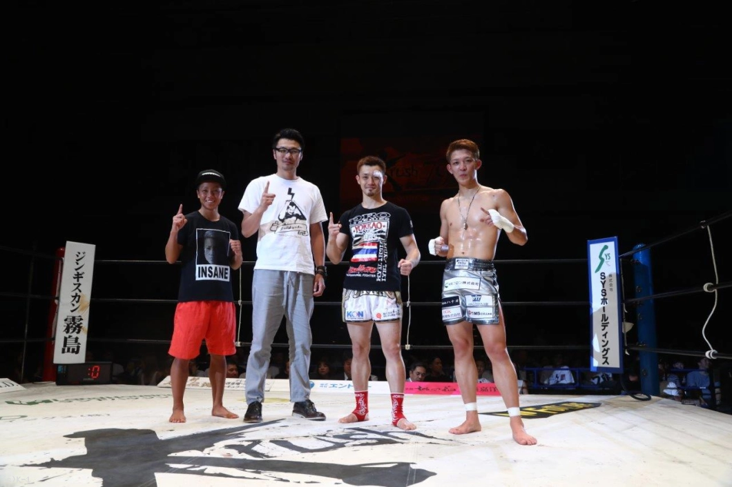 「みなさん、これがK-1チャンピオンです。この名古屋大会も僕が言い始めて第6回目の大会となりましたが、回を重ねるごとに注目のカードや完売も早くなって、今回でメインは2回目だったんですけど、対抗戦で先の2人がKOで勝ってプレッシャーがあったんですけど、何とか僕もKOできて、3人揃ってKO勝ちができてホッとしています。僕はまだまだこんなもんじゃないので期待して見ていてください」