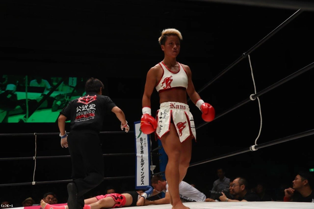 1R、エミリーはサウスポーに構えるが、KANAはエミリーが放つ左の蹴りをかわしながら圧力を掛けんとする。右・左とローを放ち、左ストレートを伸ばすエミリーだが、KANAはジリジリとロープに追い詰めていく。脇腹にミドルを打ち込むエミリーだが、KANAは下がらない。接近戦で右ボディフック・右フックと当てるKANAだが、エミリーは左ストレートをヒット。しかしKANAはプレッシャーを弱めず、終了間際に右フックをヒット。これでエミリーの腰を落とすと続けてもう1発を打ち込み、エミリーを豪快にマットへ沈めてKOした。
