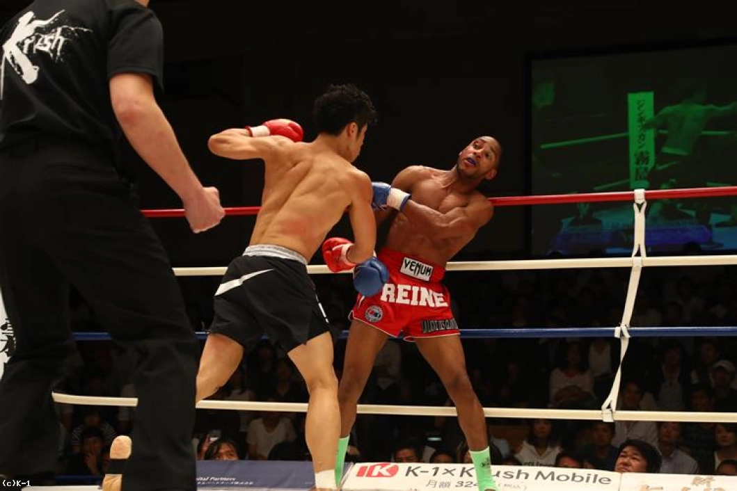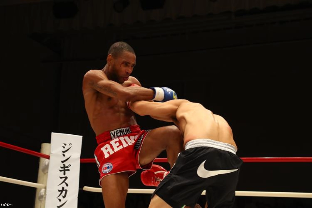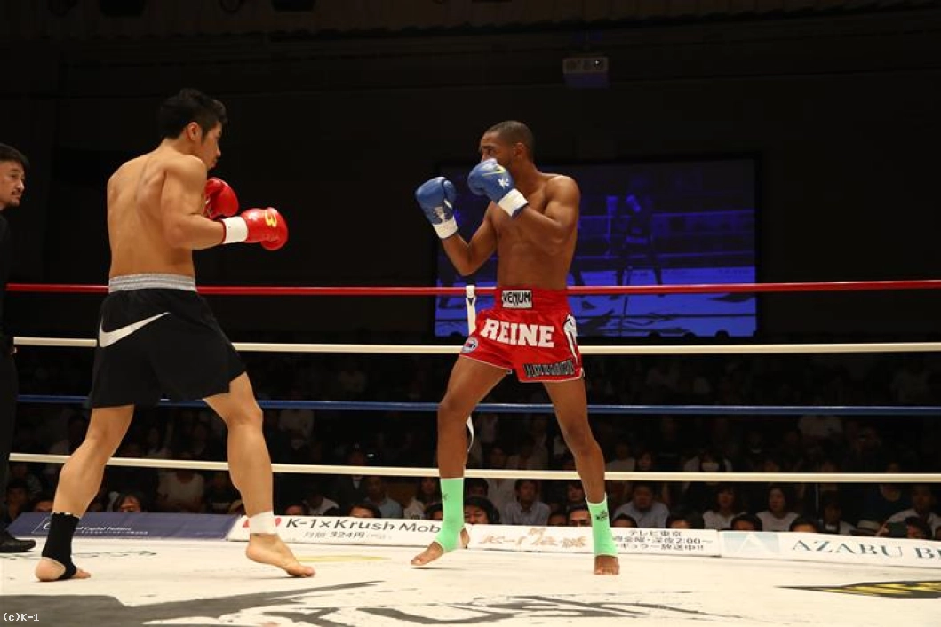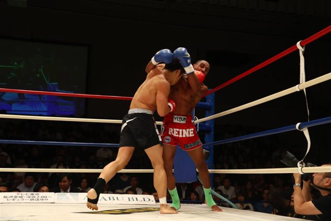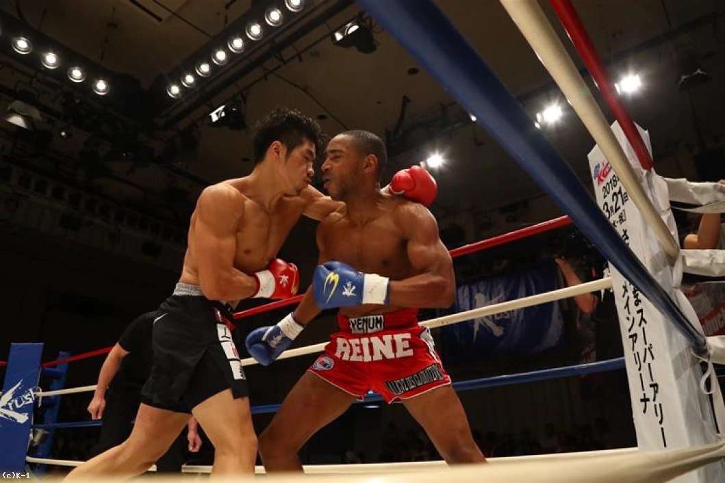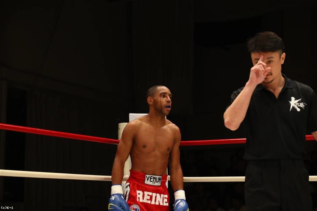 功也は圧力を発してレーヌをロープに詰める。前に出て来るレーヌだが、功也は右ハイキックを当ててフラつかせ、組みついてきても手で押してのけ反らせ、そこから右フックをヒット。さらに追撃せんと追う功也だが、ここはレーヌのジャブ&ステップに逃げられる。