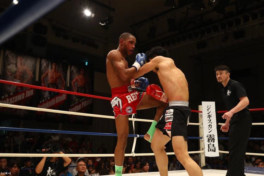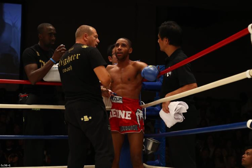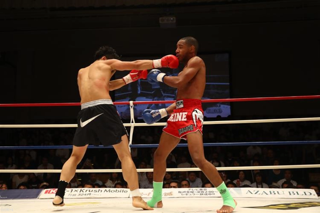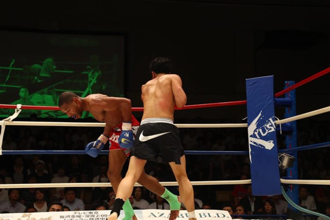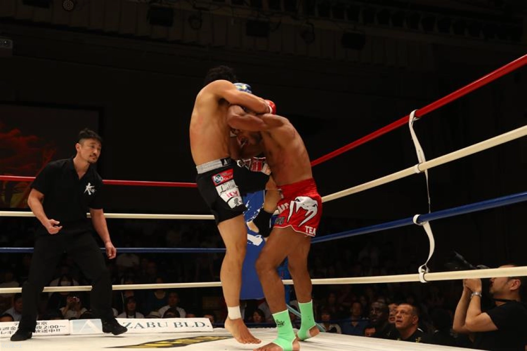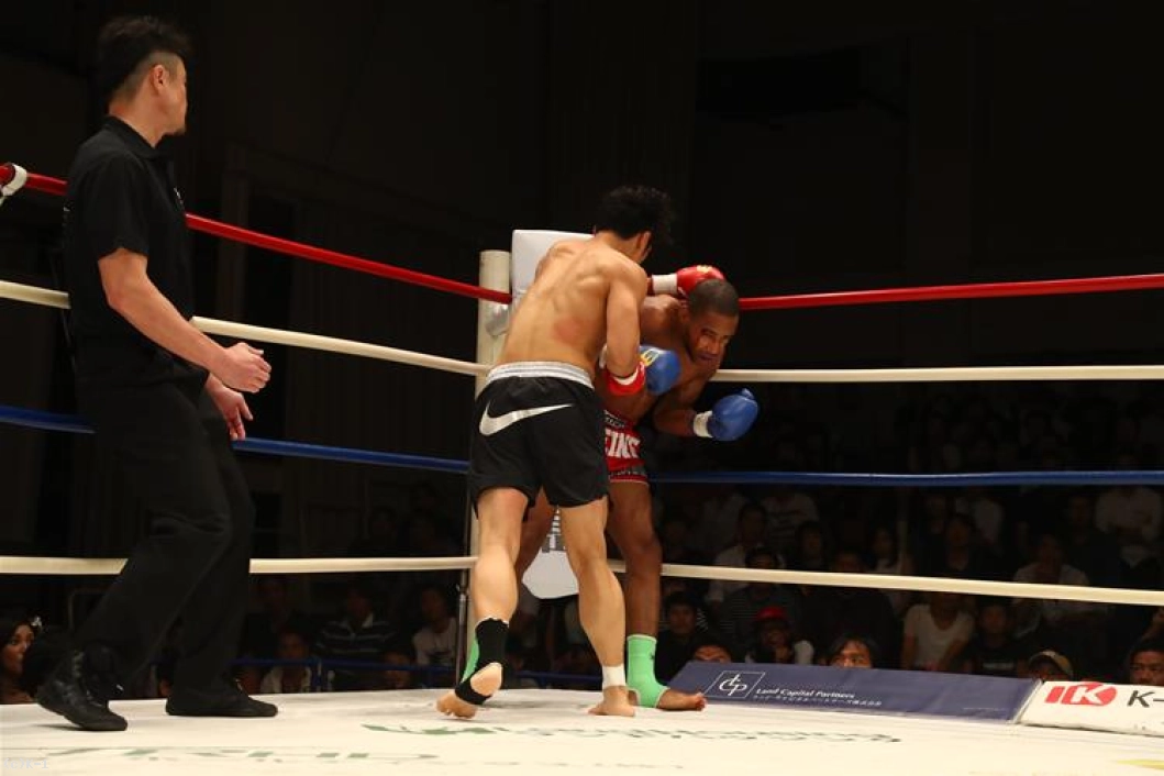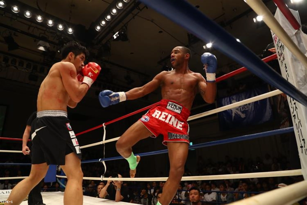 功也は圧力を発してレーヌをロープに詰める。前に出て来るレーヌだが、功也は右ハイキックを当ててフラつかせ、組みついてきても手で押してのけ反らせ、そこから右フックをヒット。さらに追撃せんと追う功也だが、ここはレーヌのジャブ&ステップに逃げられる。