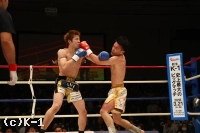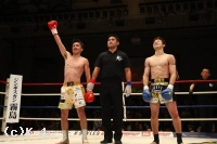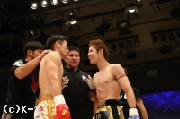 寺戸の右ローに久保は足が流れ始める。右ストレートを放つも寺戸に届かない。それでも距離を詰めると右ストレートで寺戸のアゴを跳ね上げる。寺戸はボディへのヒザそして右ロー。このローに久保の腰が落ちかける。寺戸は左右のストレートから右ローを繋いで終了する。判定は10-9、10-9、10-9の3-0で寺戸。本戦の劣勢から逆転で勝利してベルトを守った。