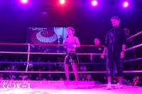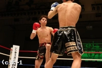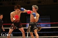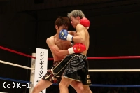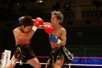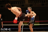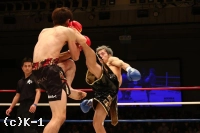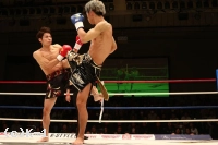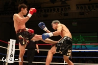 3R、金子は攻撃にパンチの配分を増やし、右クロスをヒット。出貝が腕を前に伸ばした構えでこのパンチを妨害せんとすると左ミドルを打ち込み、そこからパンチに繋げる。金子が右クロス、左フックと当てると出貝は組みついてパンチを押さえ、バックブローで反撃。金子は右クロスを当て、左三日月蹴りで出貝の脇腹を紅くさせる。出貝が左右ストレートで前に来ると、金子は右アッパーを突き上げ、左フック、右ストレートとヒットを重ねる。