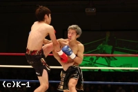1R、打ち気な様子の金子だが、出貝の顔面前蹴りを目先でかわす。その後もよく攻撃が見えており出貝の蹴りをかわして当てさせず、右ストレート、右ローをヒット。出貝は右ローを当てるが、金子は左ボディフックを打ち込みこれを効かせる。ラウンド終盤、出貝は左右ストレートの連打で出るが、金子も右ストレートを返してヒットする。