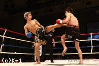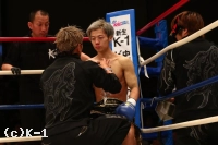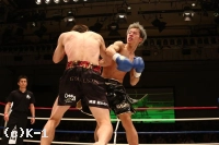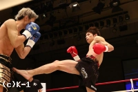 2R、出貝はボディ&顔面への前蹴り、金子は左右のミドルを放ち両者距離を探り合う。そして互いに自分の懐へ相手を入れない。出貝はバックブローを放つが、これは金子がブロック。しかしその後の顔面前蹴りは金子をとらえる。出貝は次第に試合運びにキャリアを見せてきて、バックスピンキックからストレートで前進。金子の顔面をとらえていく。