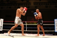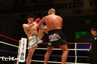 2R、KENは左ハイ・左ミドル、ジャブと攻撃を散らし杉本の前進をストップ。だが、杉本は右ローを入れて前に来るとKENをコーナーに追い詰め、右ストレートを打ち込みダウンを奪取。