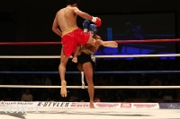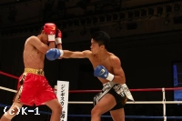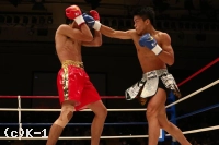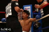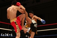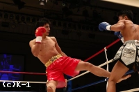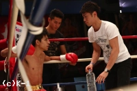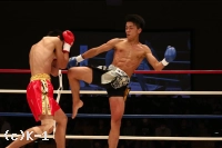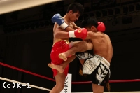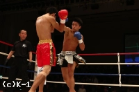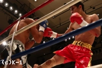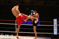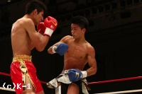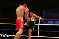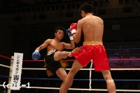 3R、鈴木はやはり中澤にロープを背負わせ、ヒザ蹴り、三日月蹴りとボディに攻撃を集める。中澤もボディフック、ロー、ミドルと鈴木を遠ざけんとするのだが、鈴木はこれをブロックで弾いて効果を半減させる。前蹴り、前足への左ローで中澤を押さえつつ鈴木は前に出ていく。