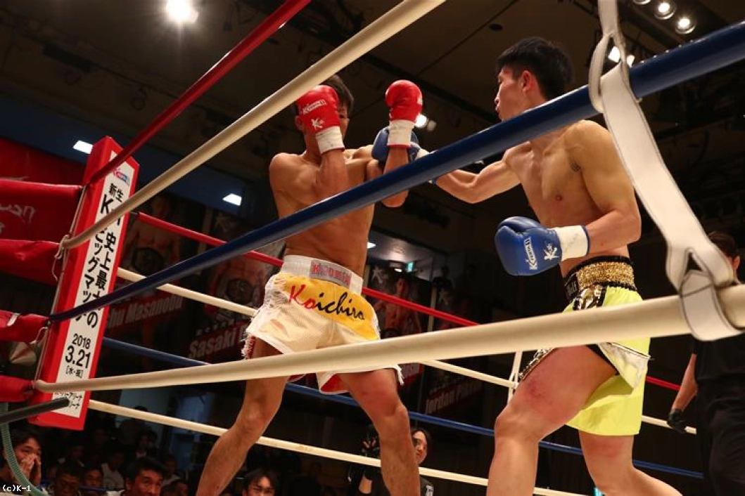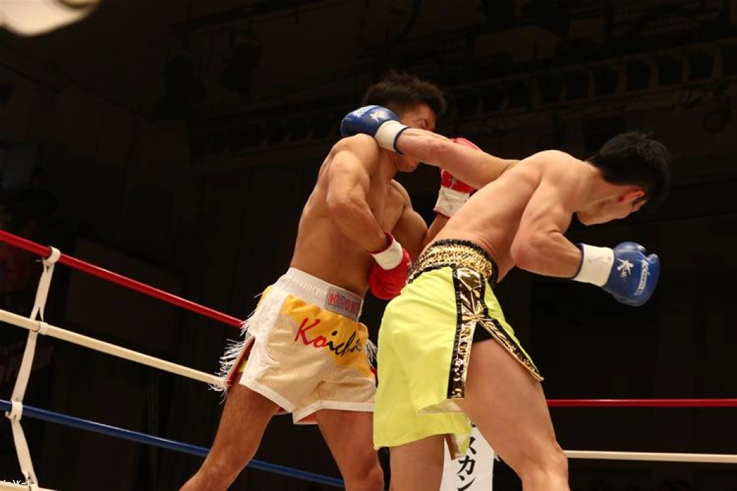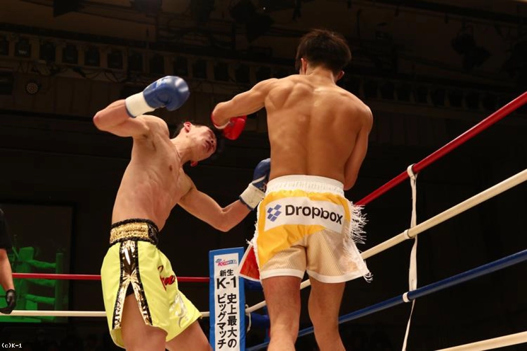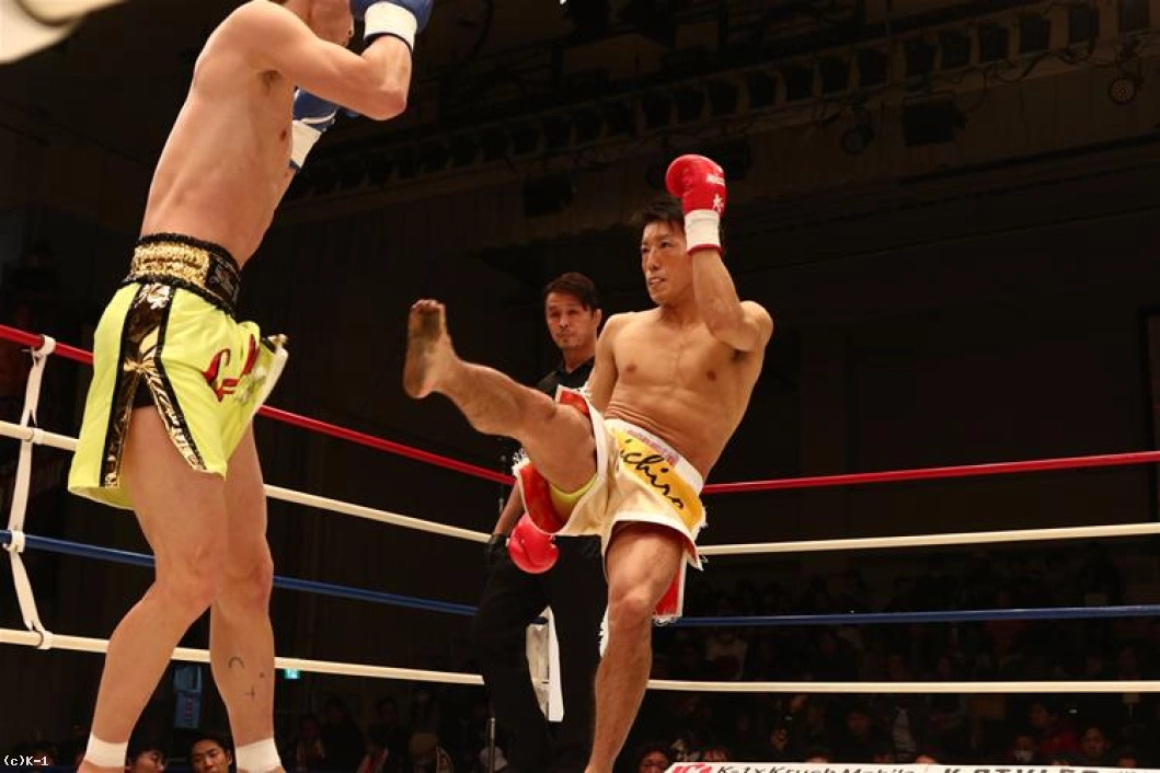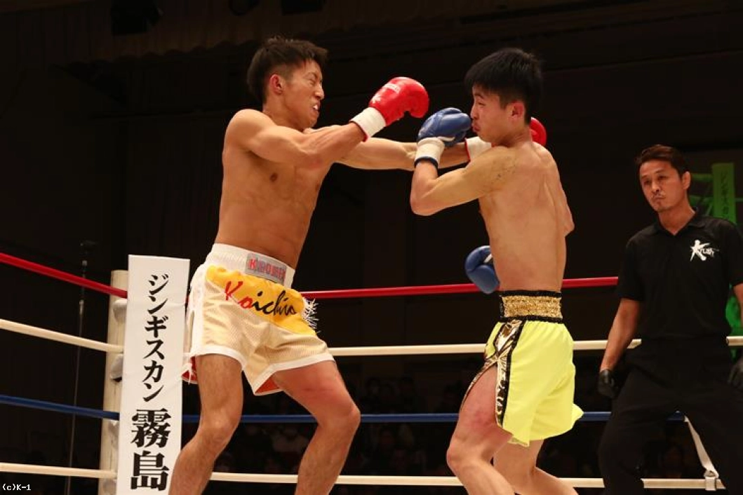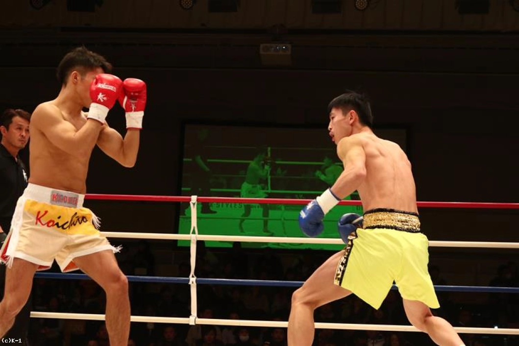 1R、両者オーソドックスからローとジャブで相手の出方を探る。鍋島は右ストレートから左のヒザをボディに送り、安達はややこれが効いた様子であったが持ち直す。そして離れた位置から鍋島に右ストレートを伸ばして当てダウンを奪う。安達はさらに右ストレート・左フックを繋いで当て、優勢で初回を終える。