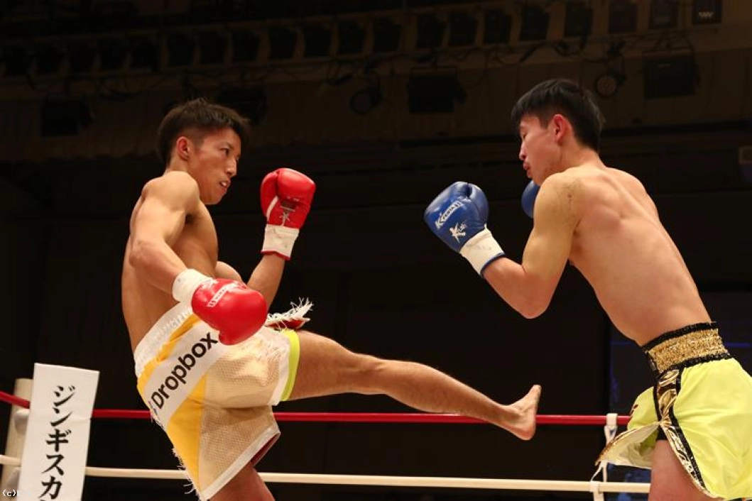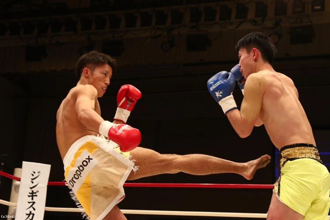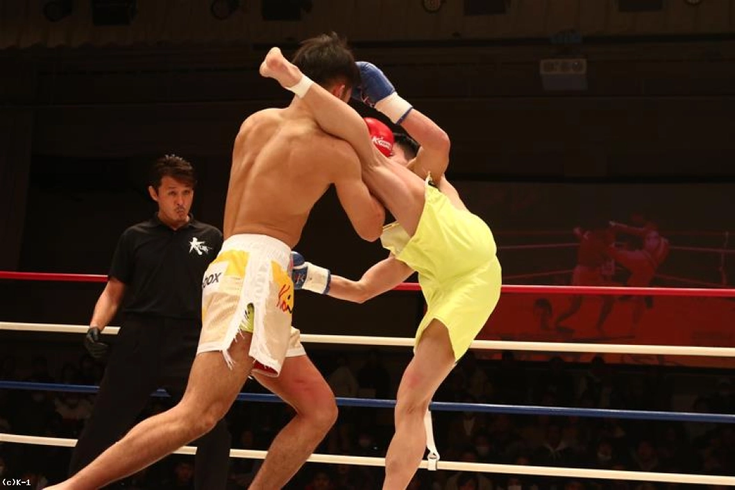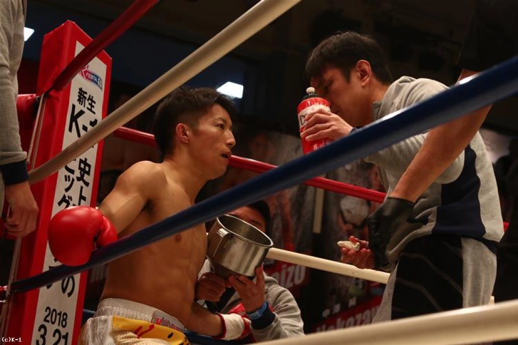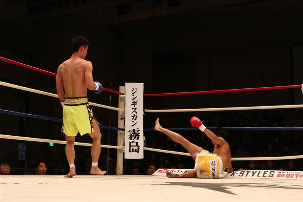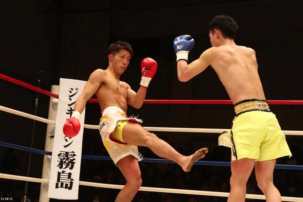1R、両者オーソドックスからローとジャブで相手の出方を探る。鍋島は右ストレートから左のヒザをボディに送り、安達はややこれが効いた様子であったが持ち直す。そして離れた位置から鍋島に右ストレートを伸ばして当てダウンを奪う。安達はさらに右ストレート・左フックを繋いで当て、優勢で初回を終える。
