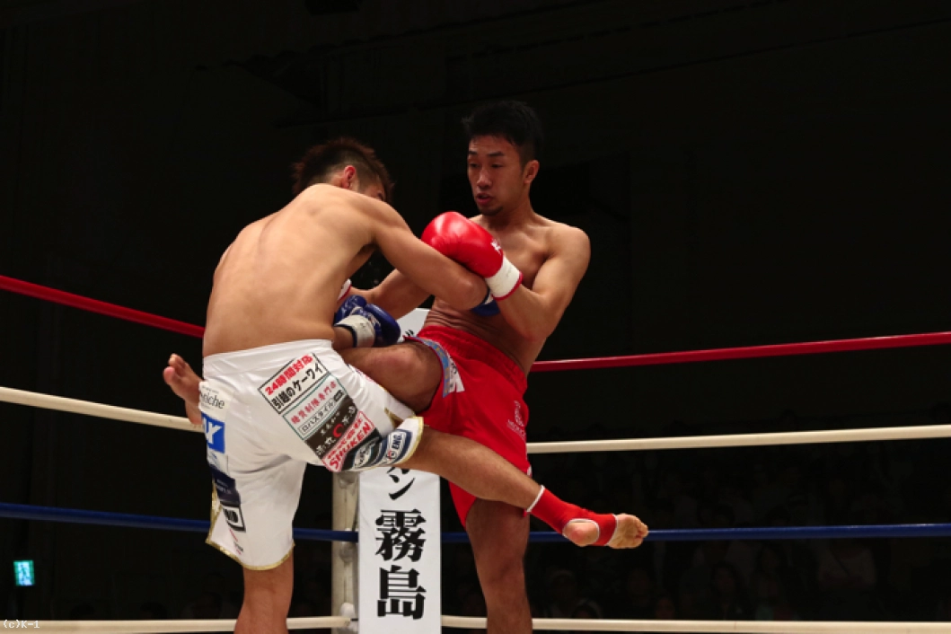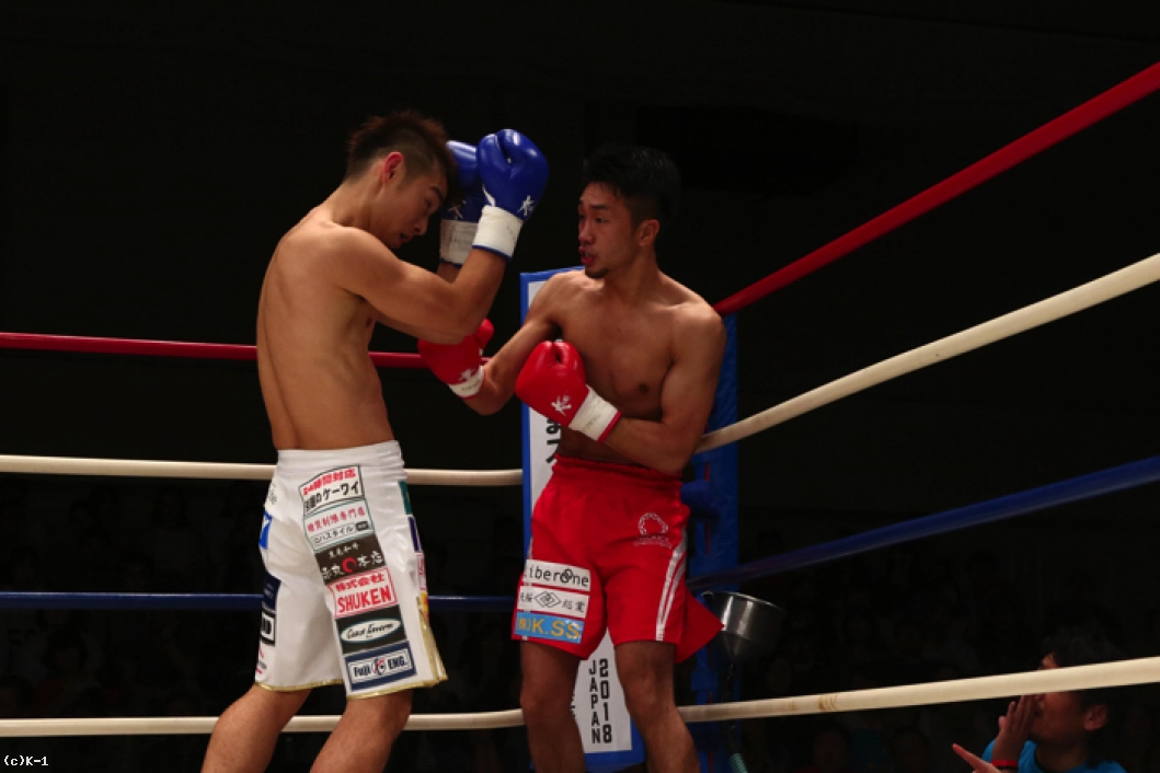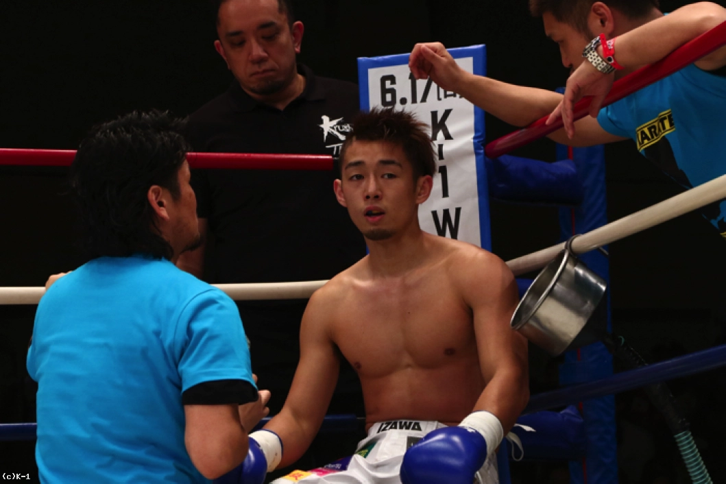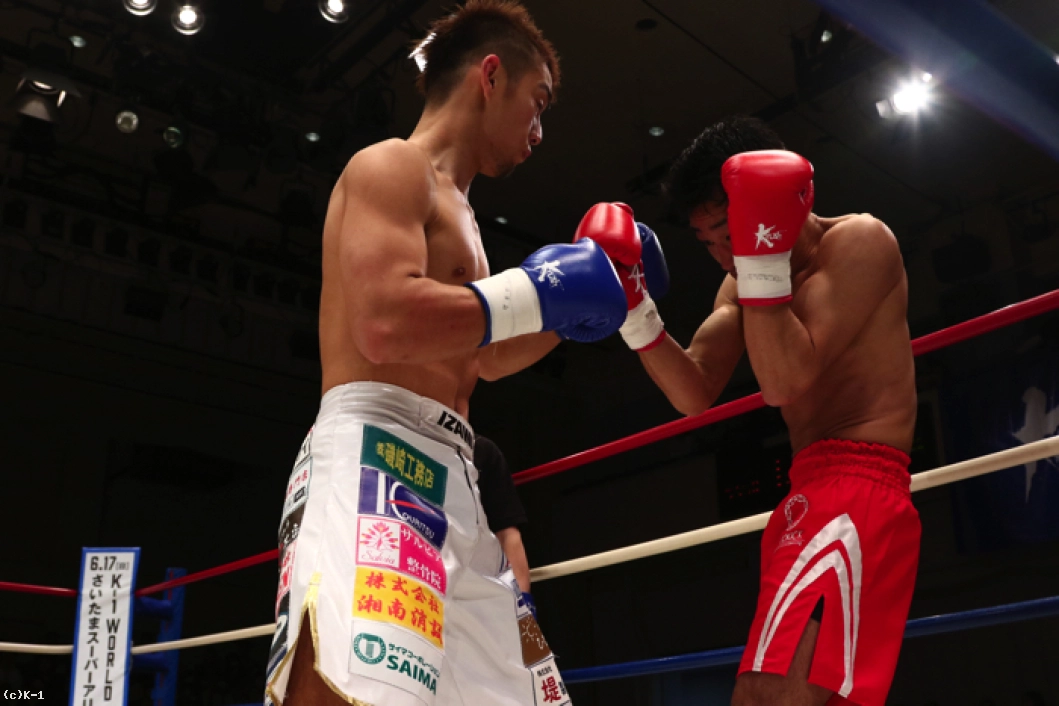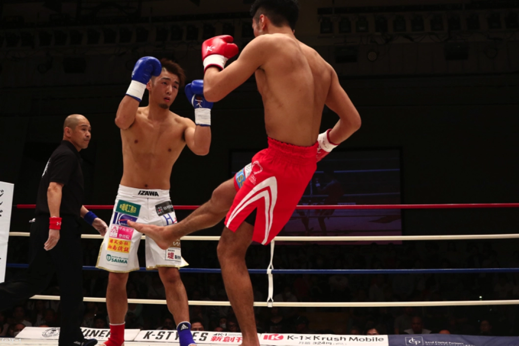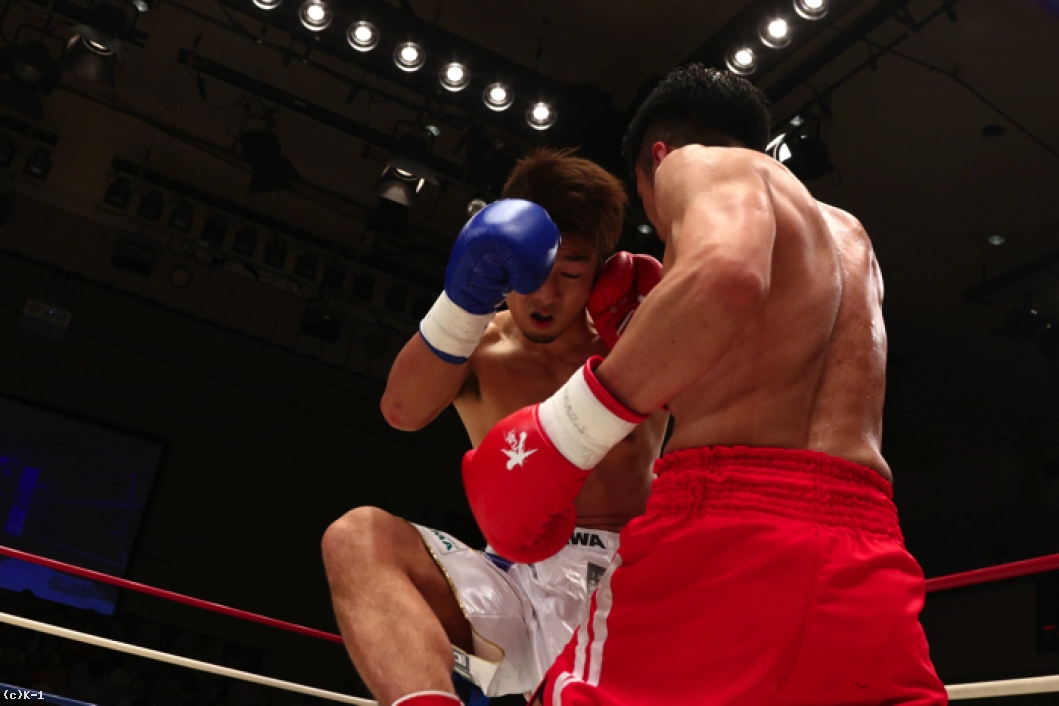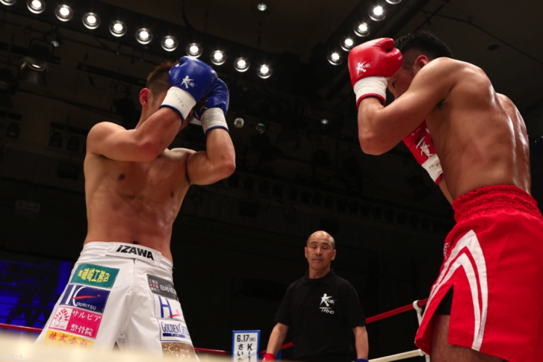 1R、伊澤は上段への後ろ回し蹴りをいきなり見せる。しかし神戸はこれをブロックして当てさせず、前蹴りと左右のフックを走らせる。だが、伊澤もガードをしっかり固めてこれを弾き、前に出てローを当てていく。神戸はロープを背負いながらフック、ハイキックで応戦するが、伊澤はボディフックを効かせ、そこから神戸をさらに攻める。神戸はしかしヒザ、前蹴り、フックと打ち返す。