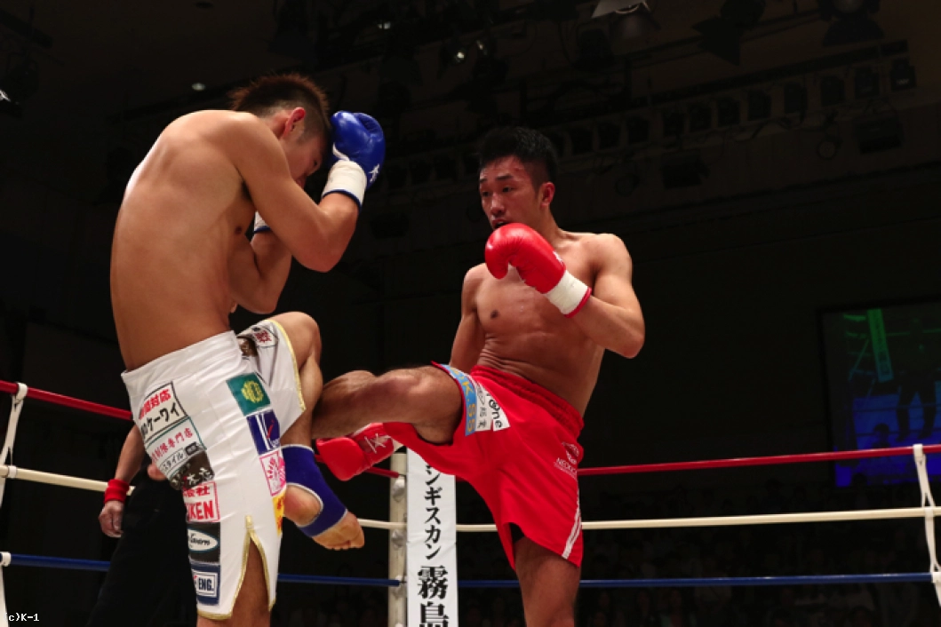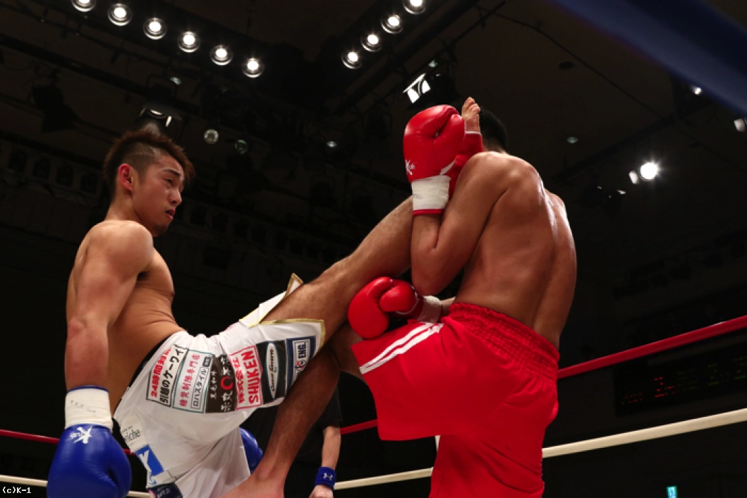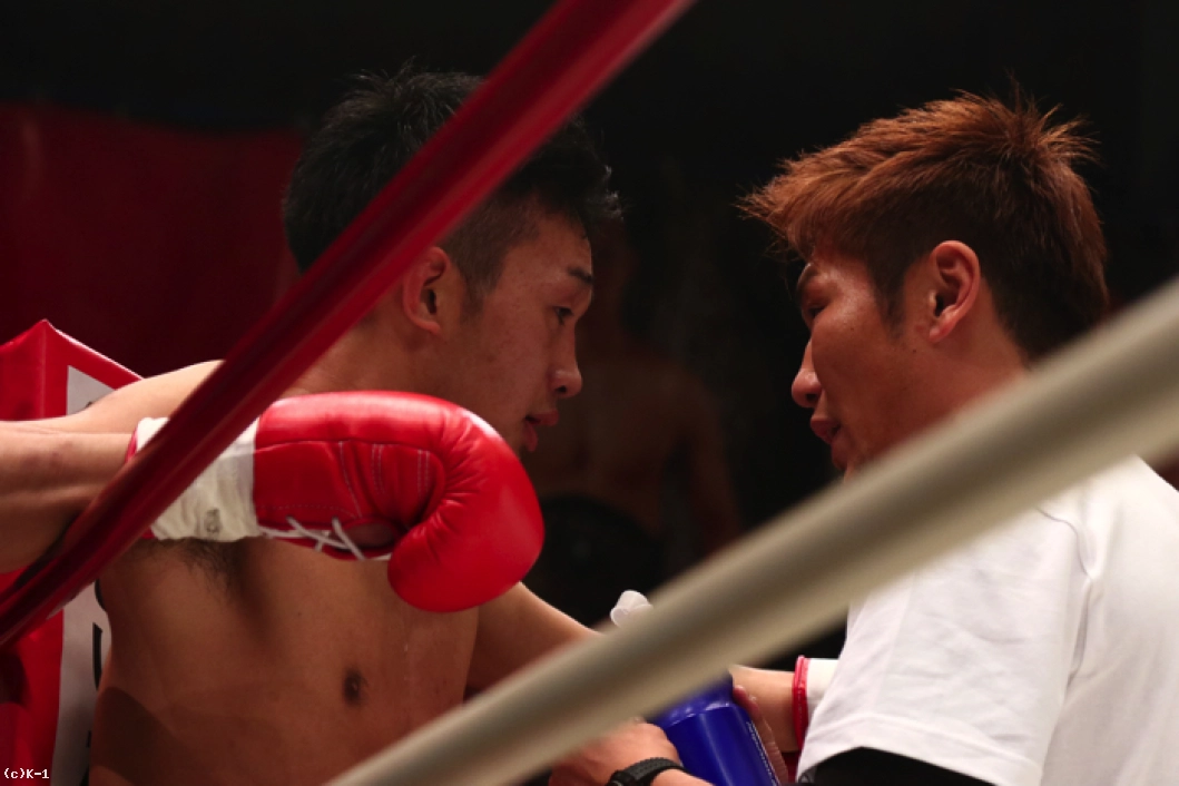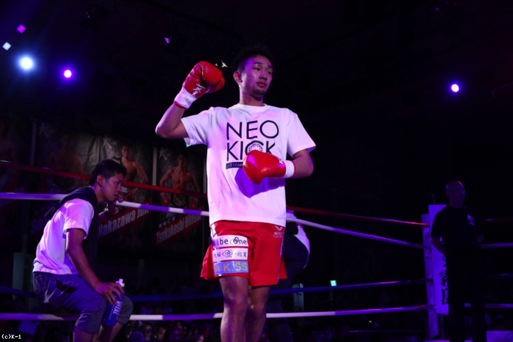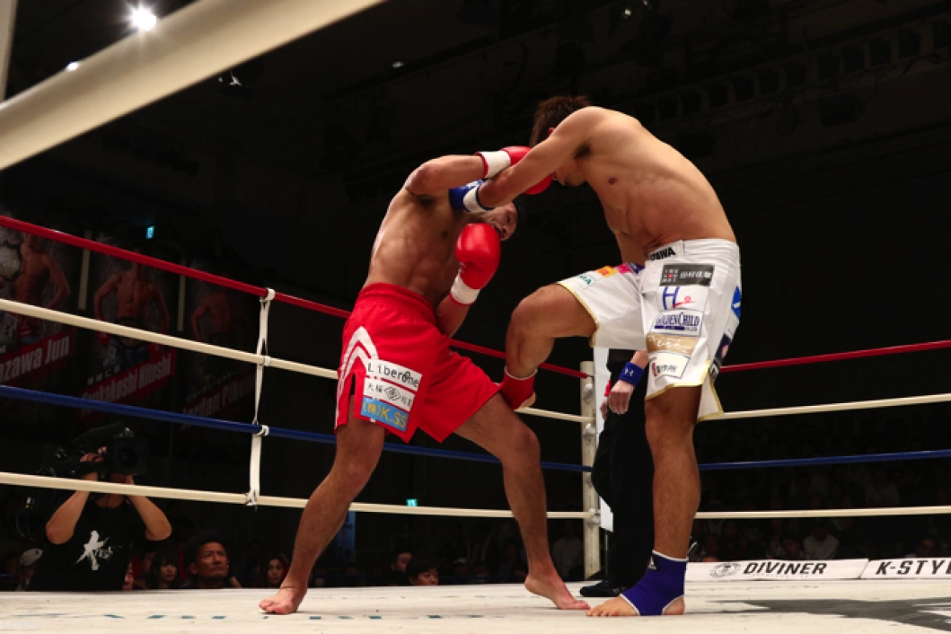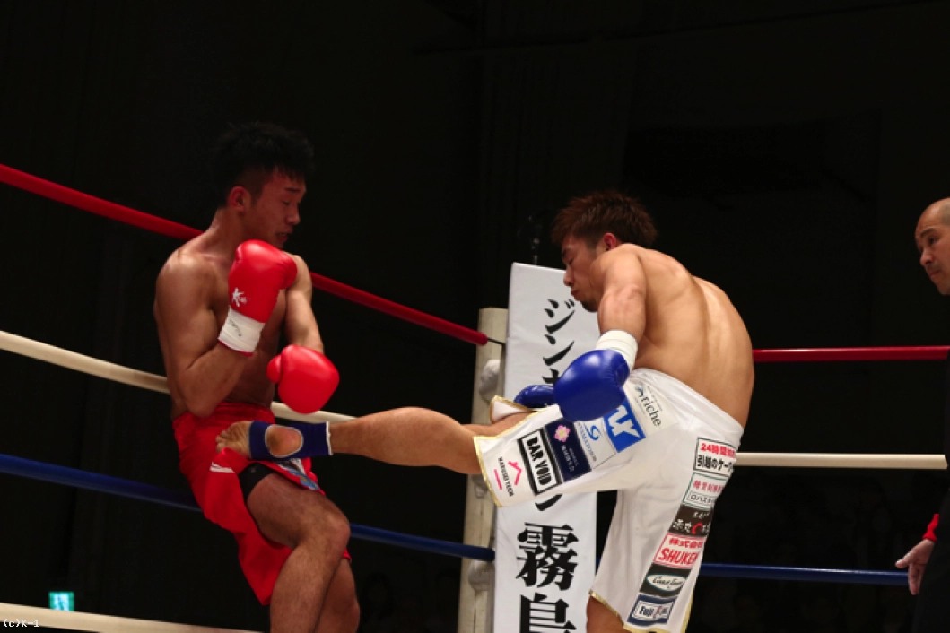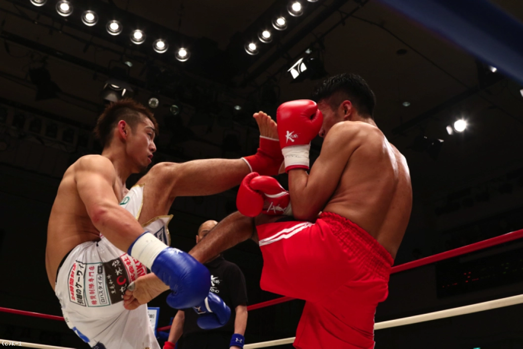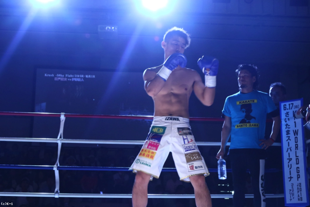 1R、伊澤は上段への後ろ回し蹴りをいきなり見せる。しかし神戸はこれをブロックして当てさせず、前蹴りと左右のフックを走らせる。だが、伊澤もガードをしっかり固めてこれを弾き、前に出てローを当てていく。神戸はロープを背負いながらフック、ハイキックで応戦するが、伊澤はボディフックを効かせ、そこから神戸をさらに攻める。神戸はしかしヒザ、前蹴り、フックと打ち返す。